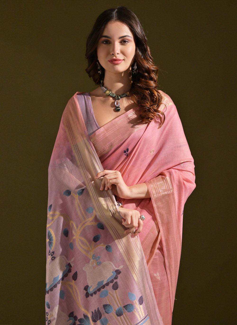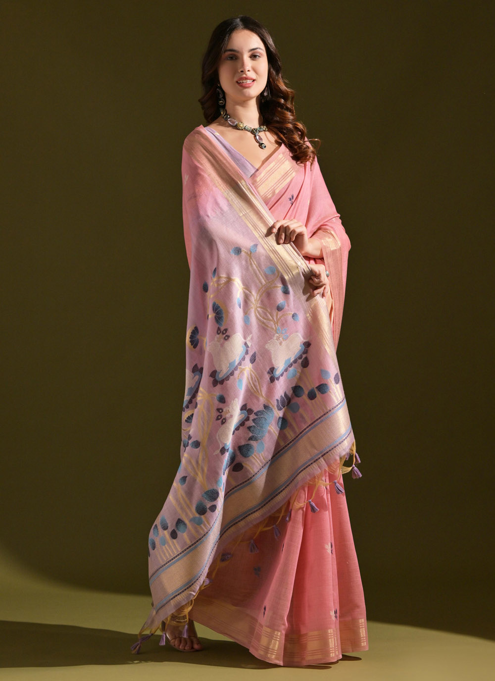 Experience the comfort of premium cotton with this Designer Woven Saree in delightful pink. The soft texture and artistic weave create a look that is effortlessly stylish. perfect for both casual elegance and semi-formal occasions. Comes with matching blouse.