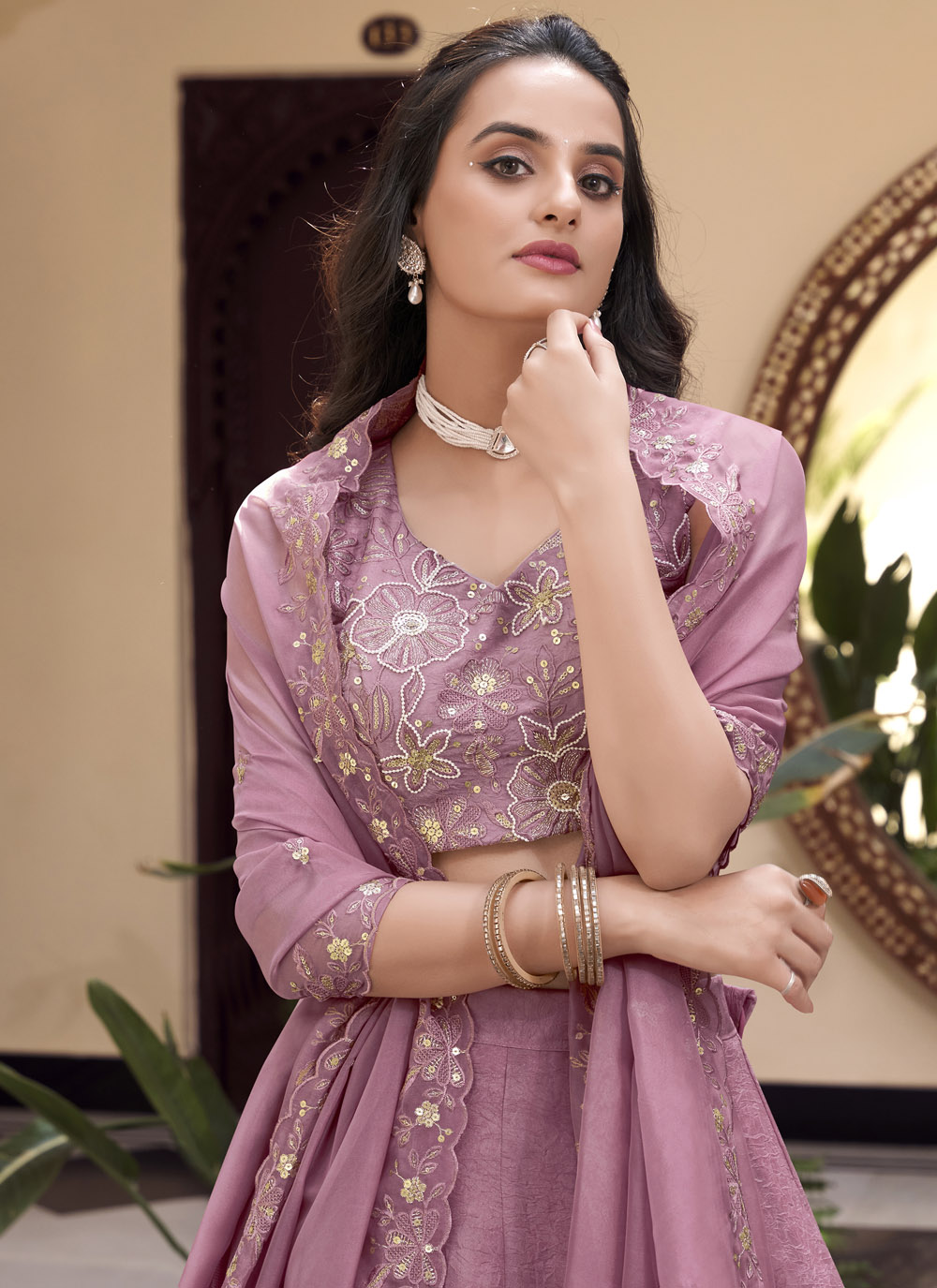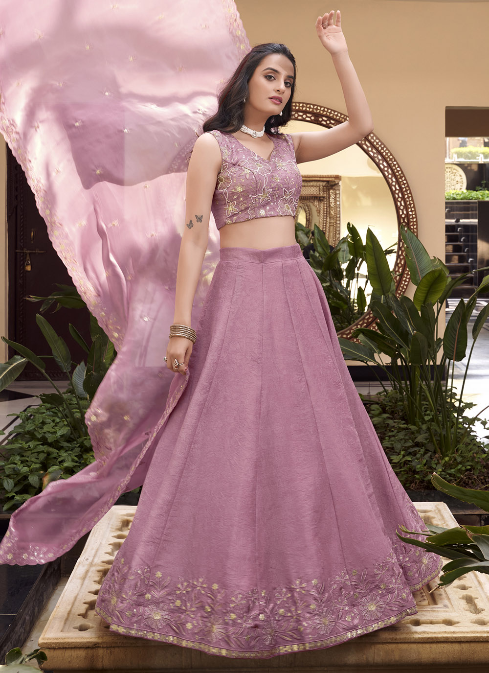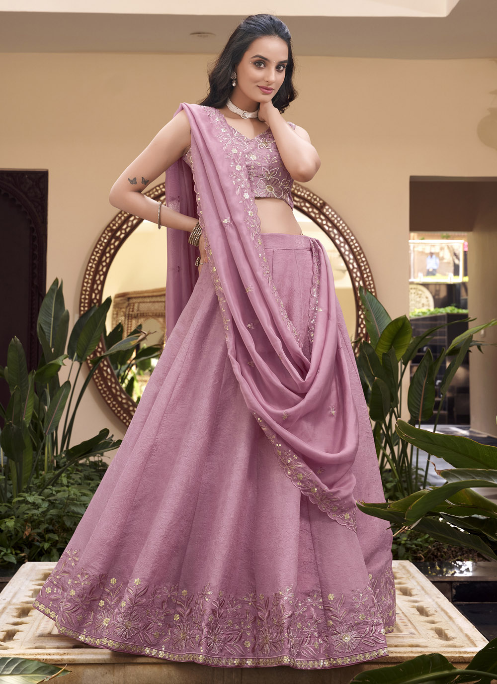 Step into the spotlight with this Trendy Pink Lehenga Choli, featuring intricate embroidery on crush fabric. Perfect for haldi, mehndi, or daytime functions where comfort meets charm. Comes with matching choli and dupatta.