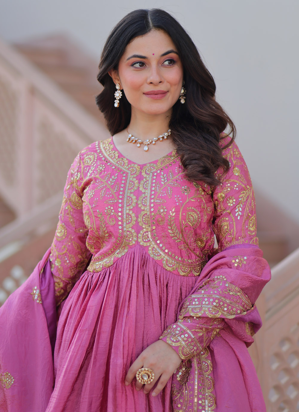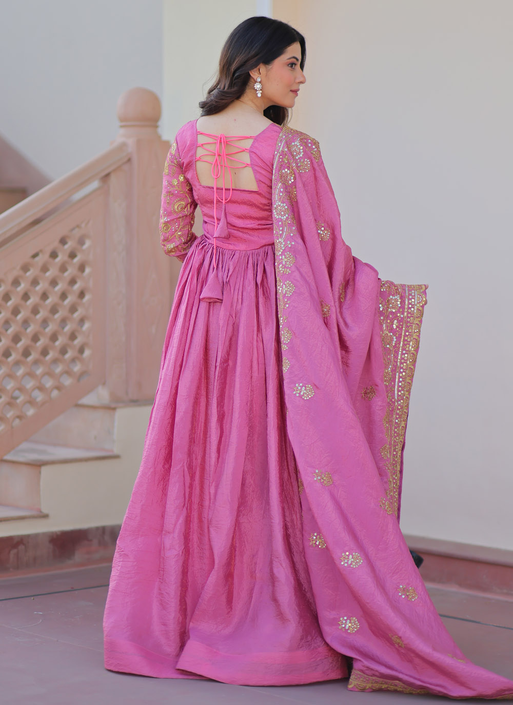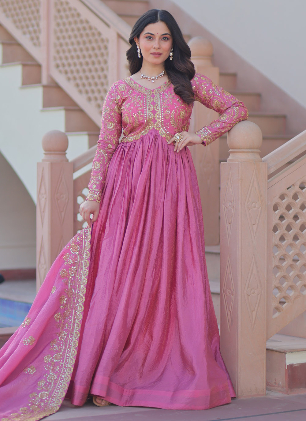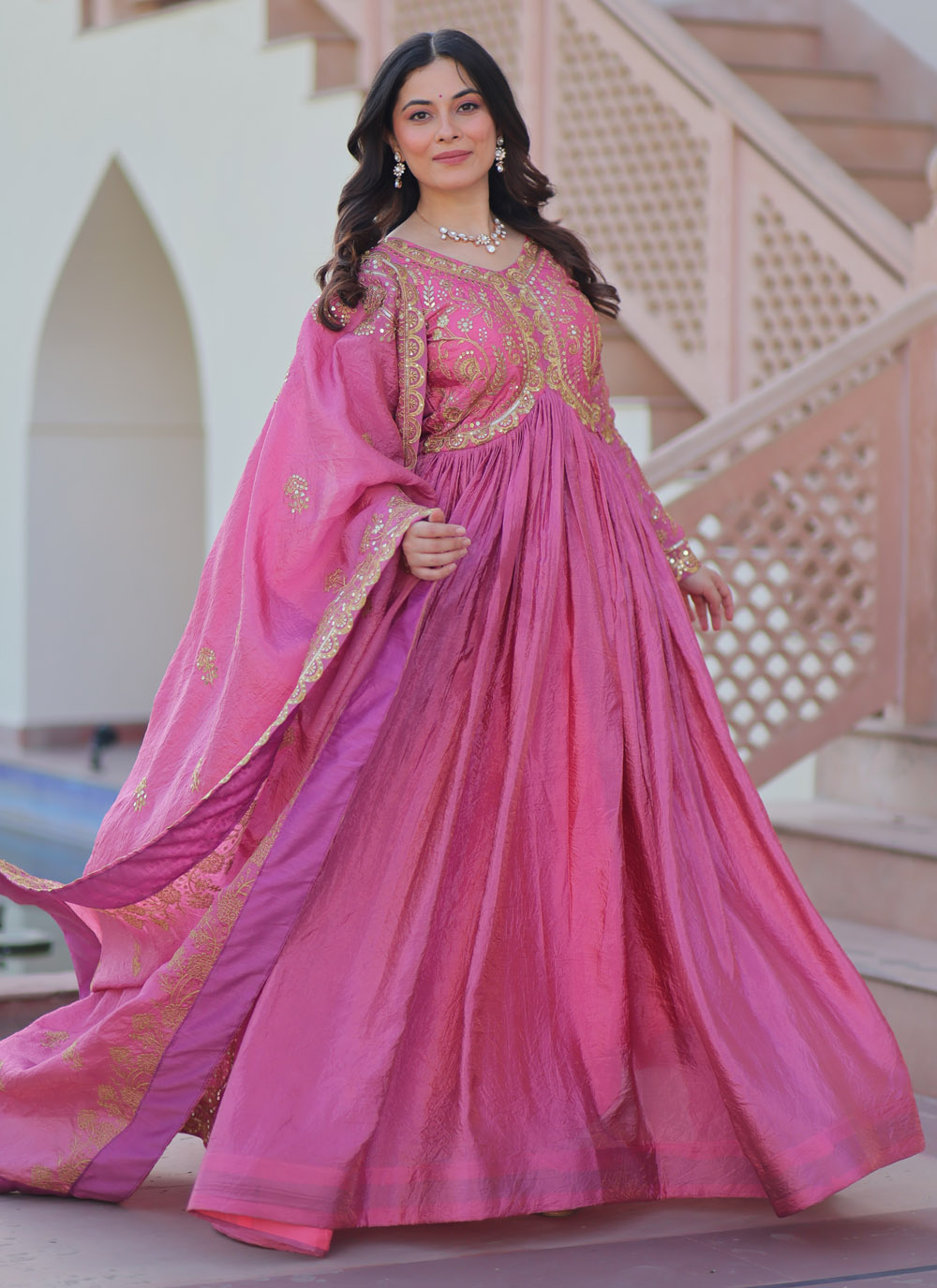 Make a lasting impression in this pink crush gown adorned with sparkling sequins and artistic multi embroidery. The contemporary design blends traditional craftsmanship with modern allure, creating a statement ensemble for weddings, sangeet nights, or glamorous soirées. Comes with matching dupatta.