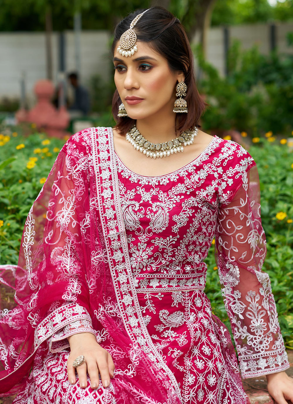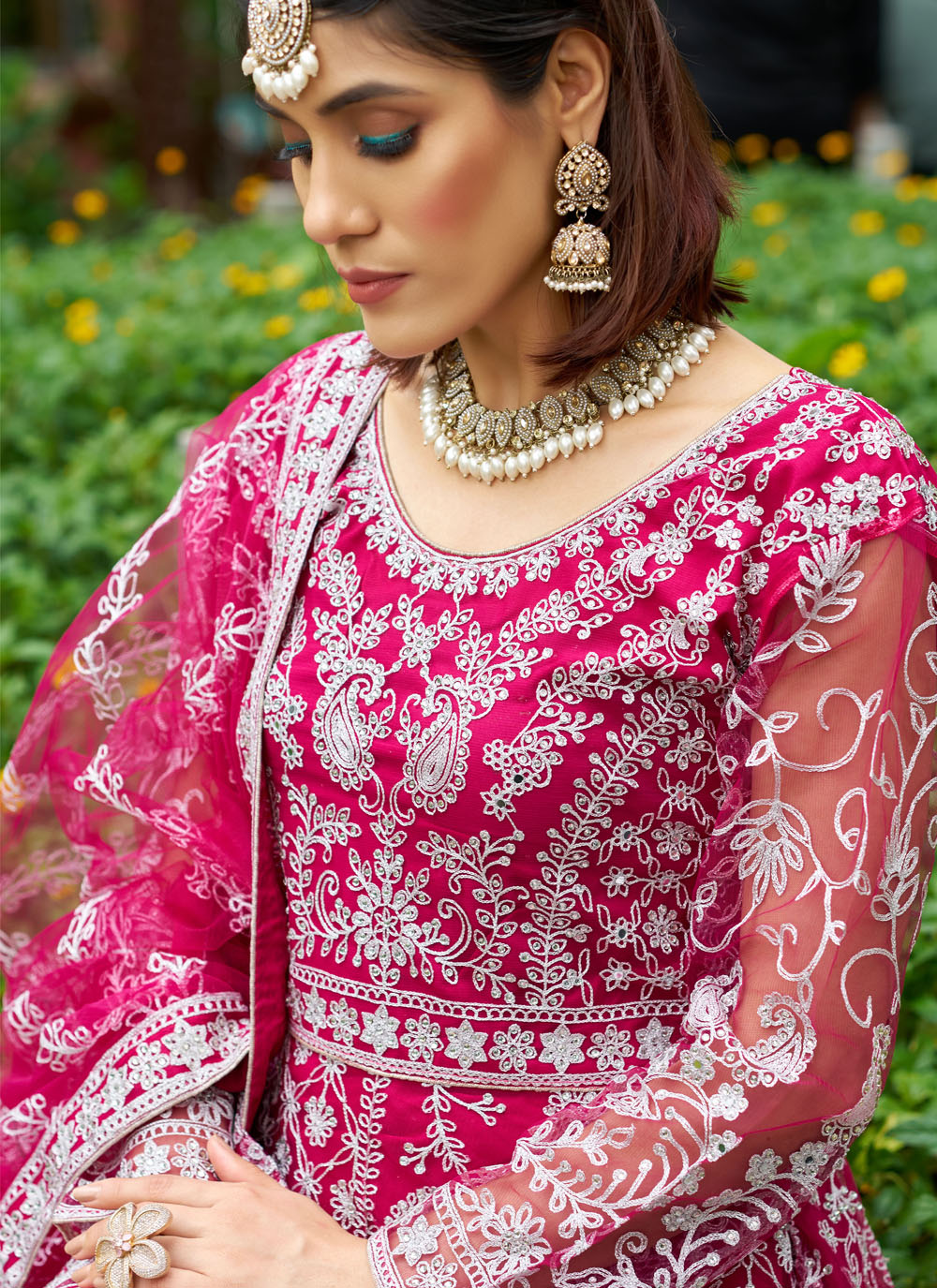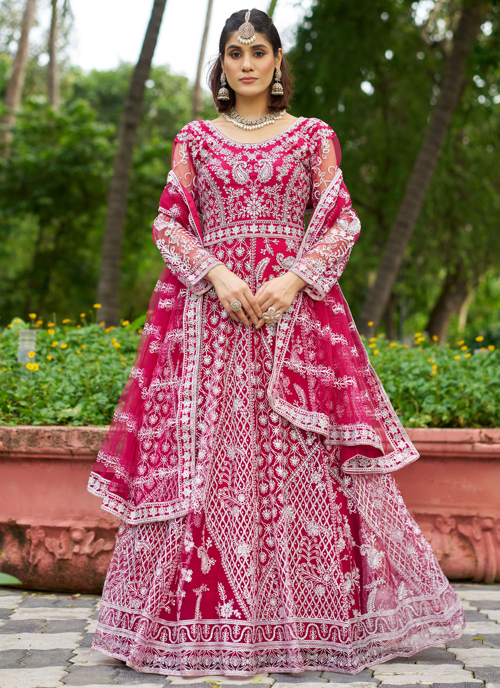 This pink engagement gown is designed in soft net fabric and highlighted beautifully with shimmering diamond work. The graceful embroidery flows across the bodice and flares out into a dreamy silhouette. Comes with matching dupatta.