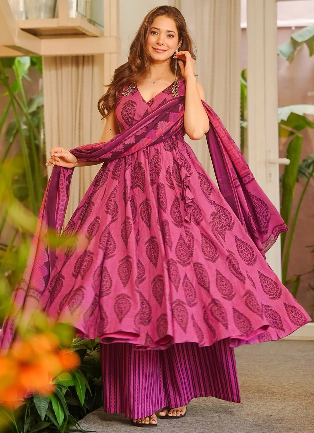 This pink muslin digital printed palazzo salwar suit combines traditional elegance with modern comfort. The premium muslin fabric provides a smooth and airy texture, while the artistic digital print adds charm and uniqueness. Comes with matching bottom and dupatta.