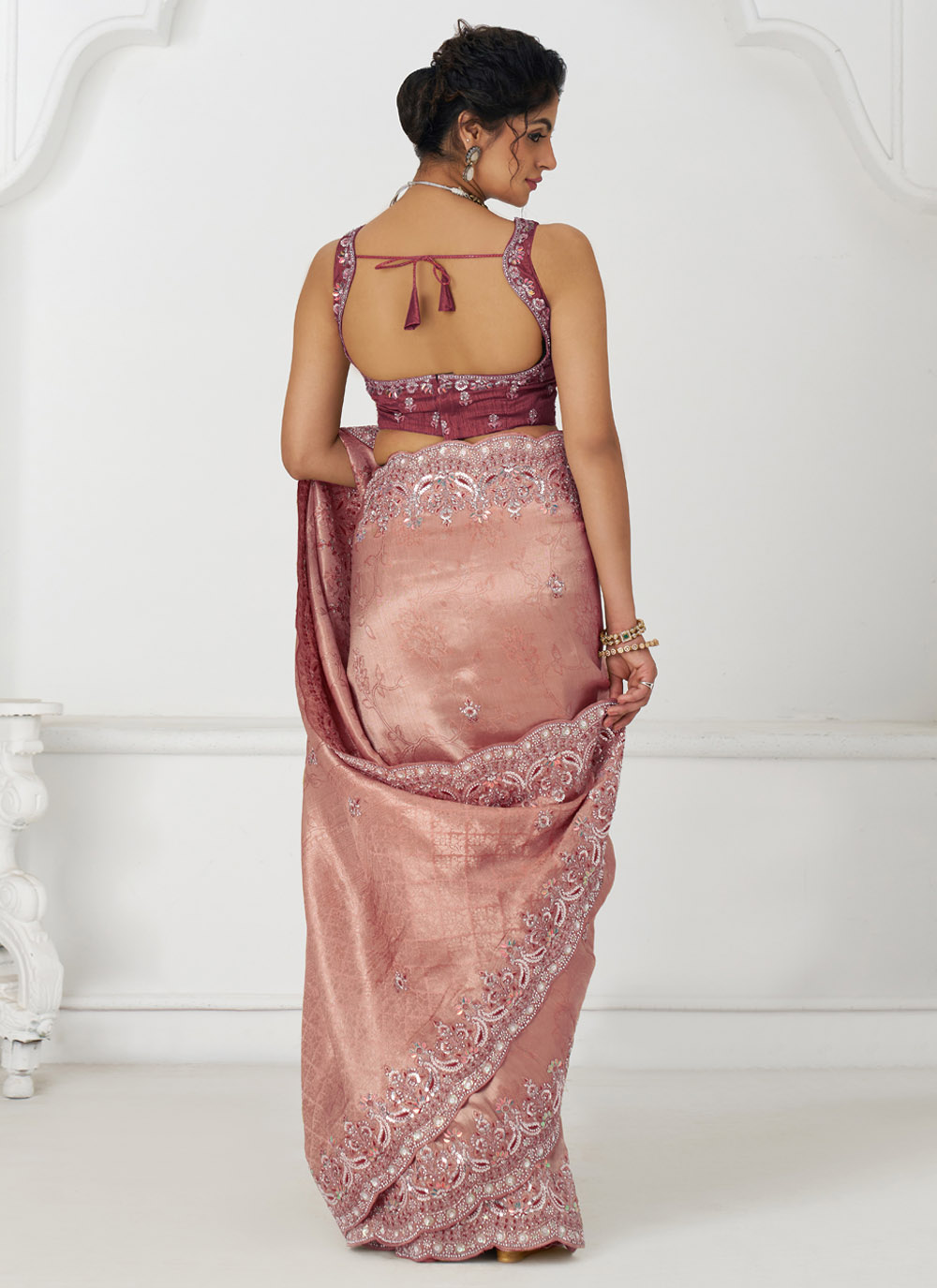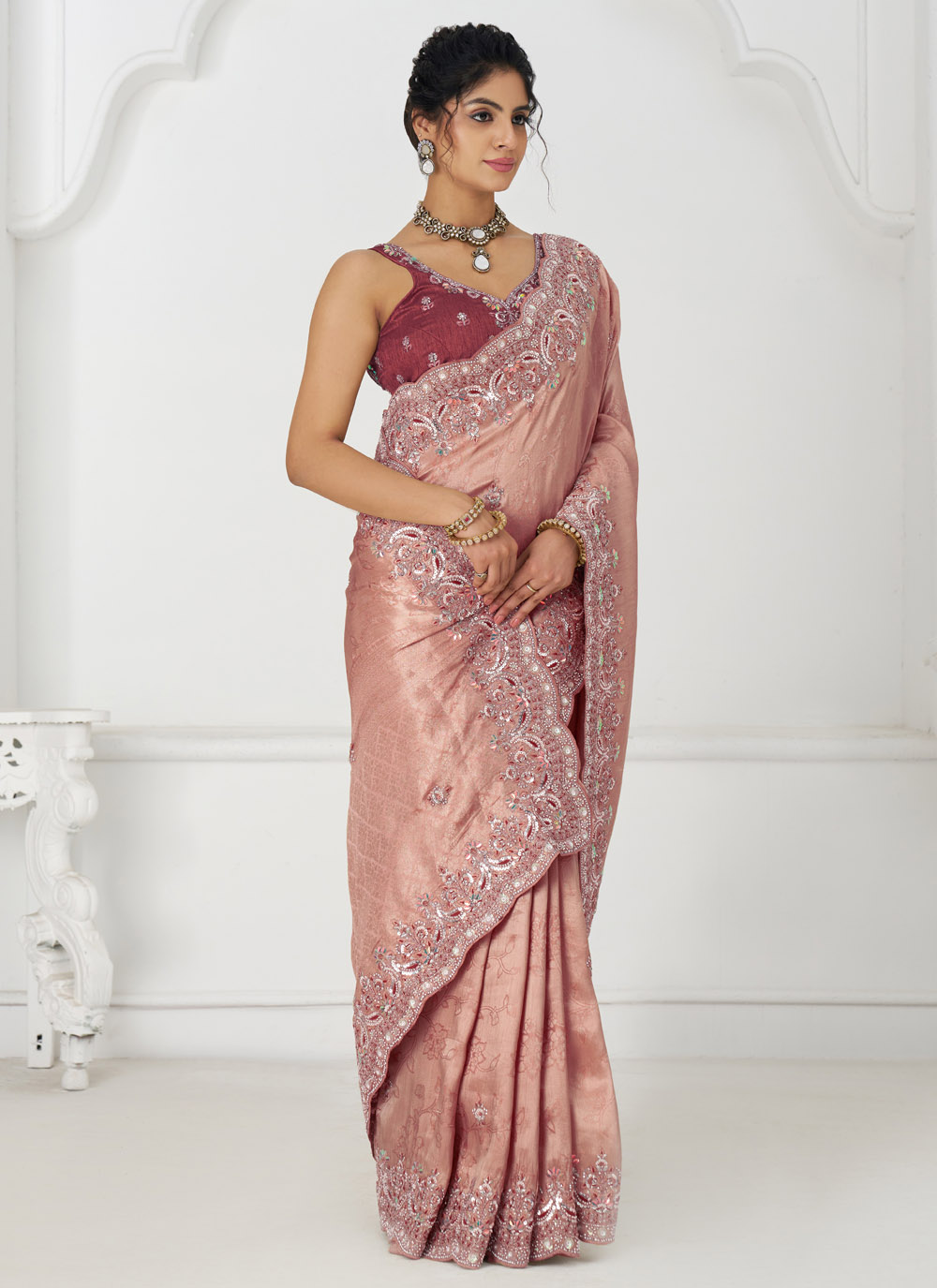 Grace your special moments with this Pink Dola Viscose Saree, exquisitely embroidered with shimmering sequins and beads. The soft fabric and detailed craftsmanship make it a stunning pick for weddings, receptions, or festive occasions. Comes with matching blouse.