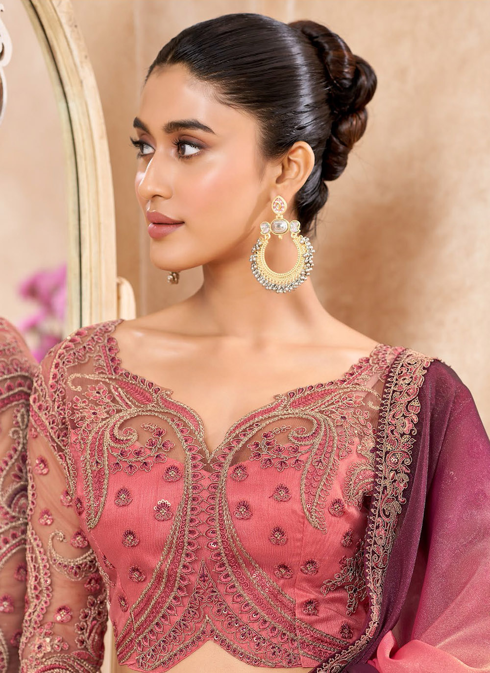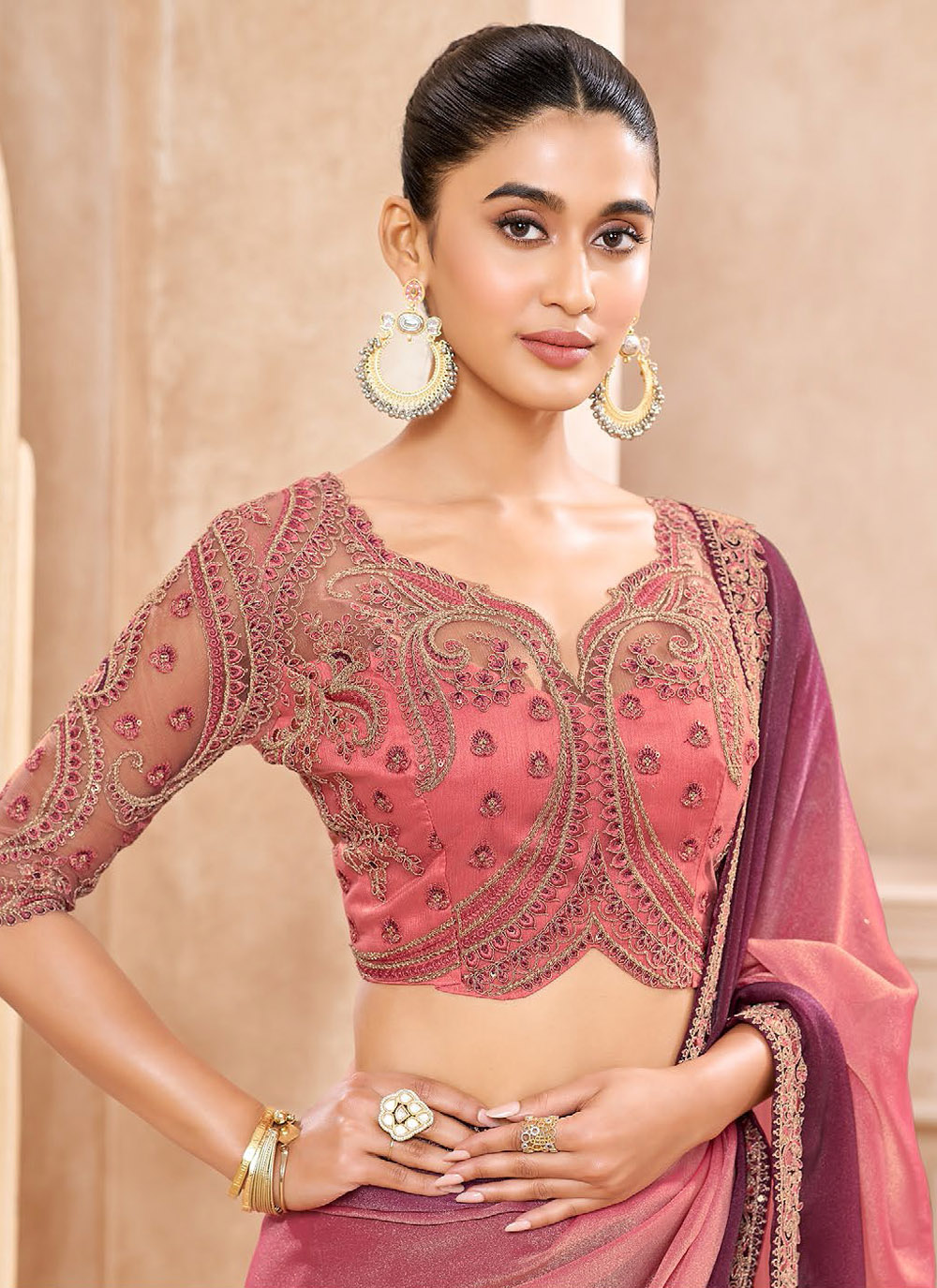 Enhance your engagement style with this Pink Fandy Saree highlighted by delicate embroidered borders. Lightweight and elegant, it ensures comfort while maintaining a designer look. Comes with matching blouse.