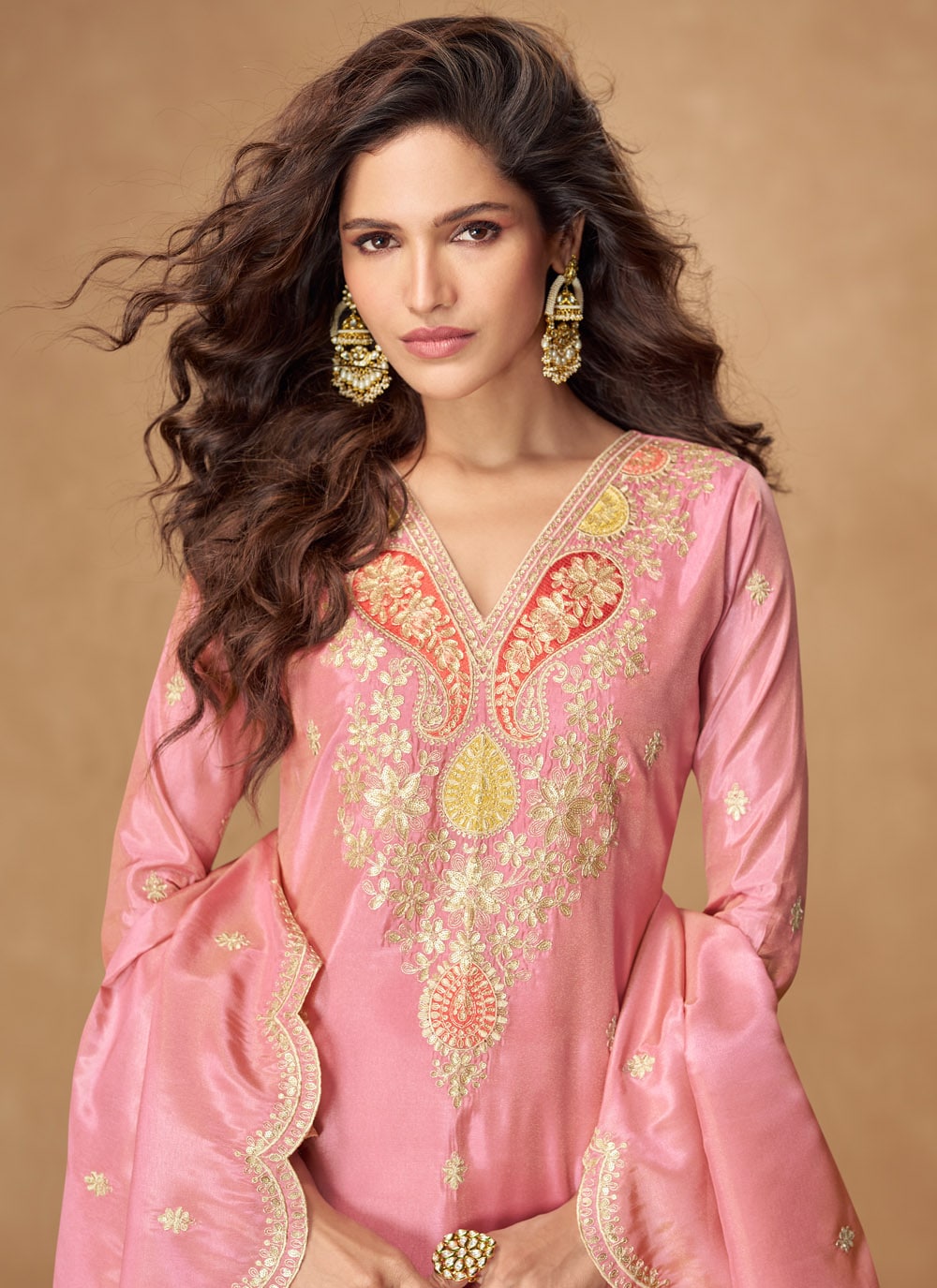 Grace meets glamour in this pink shimmer palazzo salwar suit, adorned with exquisite zari embroidery. The flowing silhouette paired with wide-leg palazzos creates a flattering look perfect for festive occasions or grand celebrations. Comes with matching bottom and dupatta.