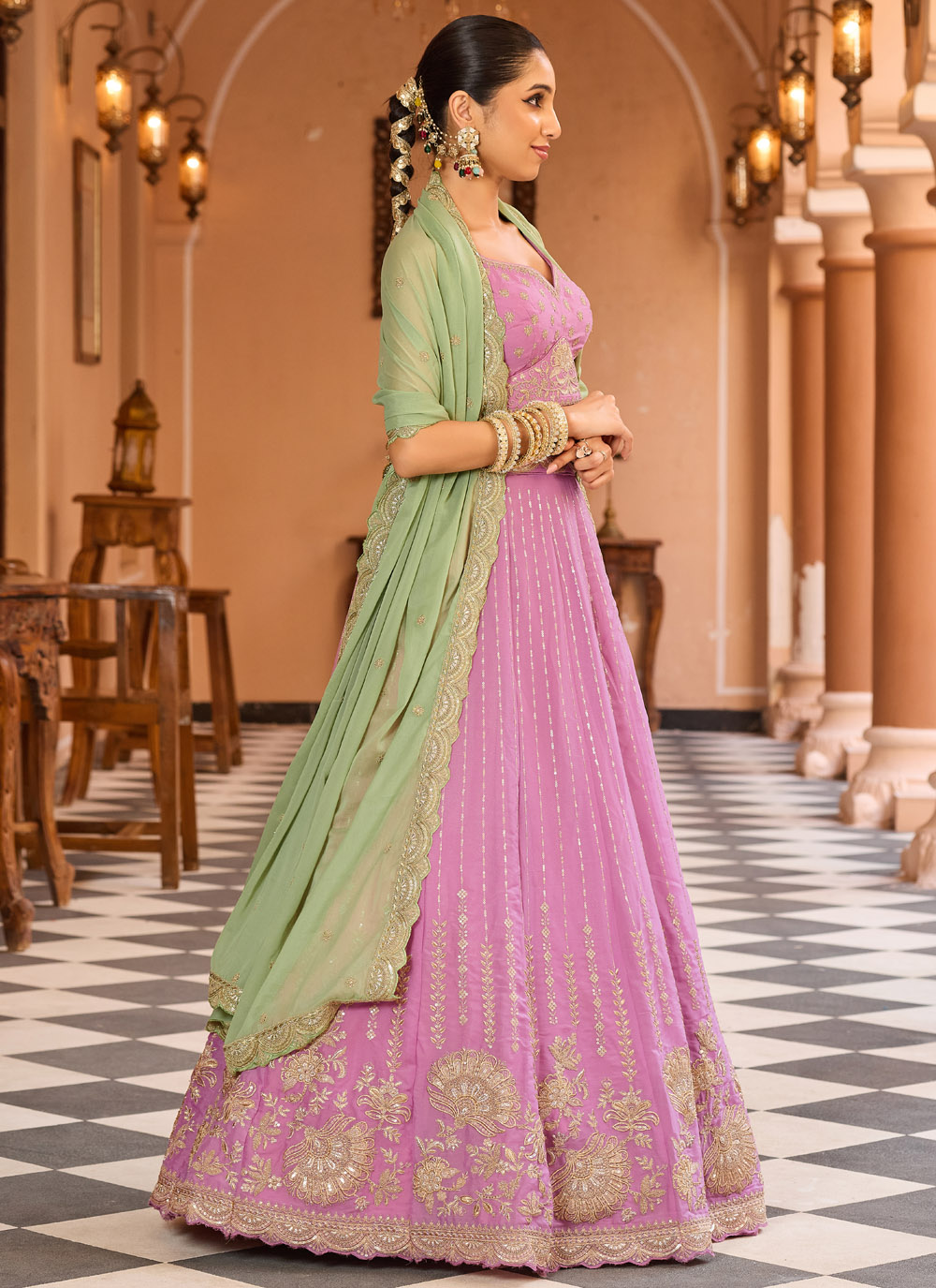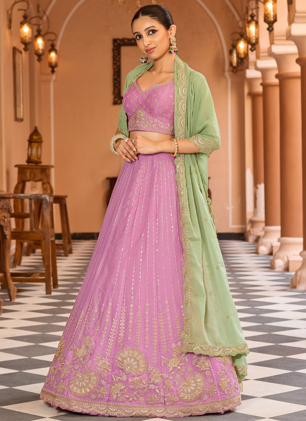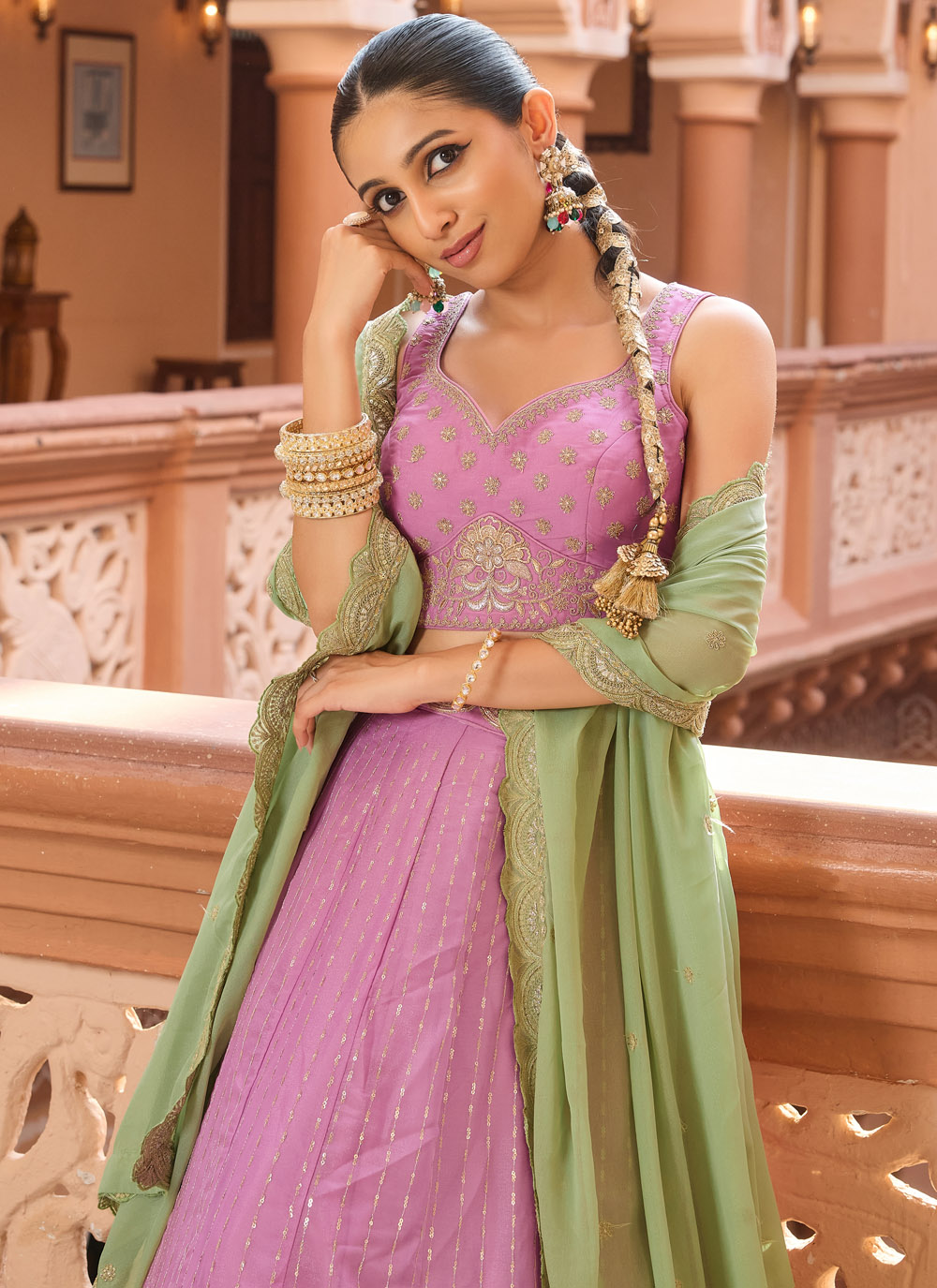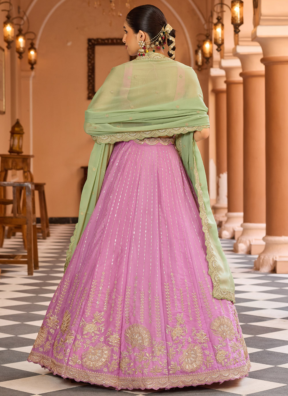 This pink tissue silk lehenga choli is beautifully crafted with delicate thread and zari embroidery, giving it a soft yet stylish appeal. The shimmering texture of tissue silk pairs gracefully with the intricate motifs, making it a standout choice for reception celebrations and grand functions. Comes with matching choli and dupatta.