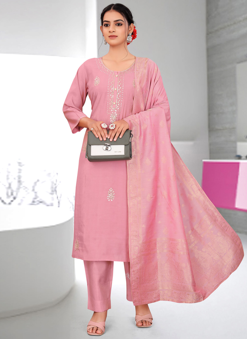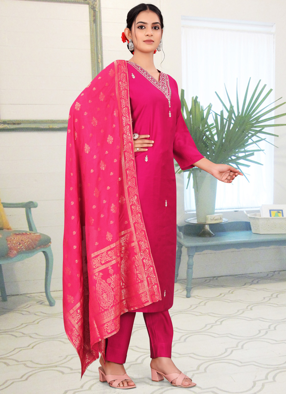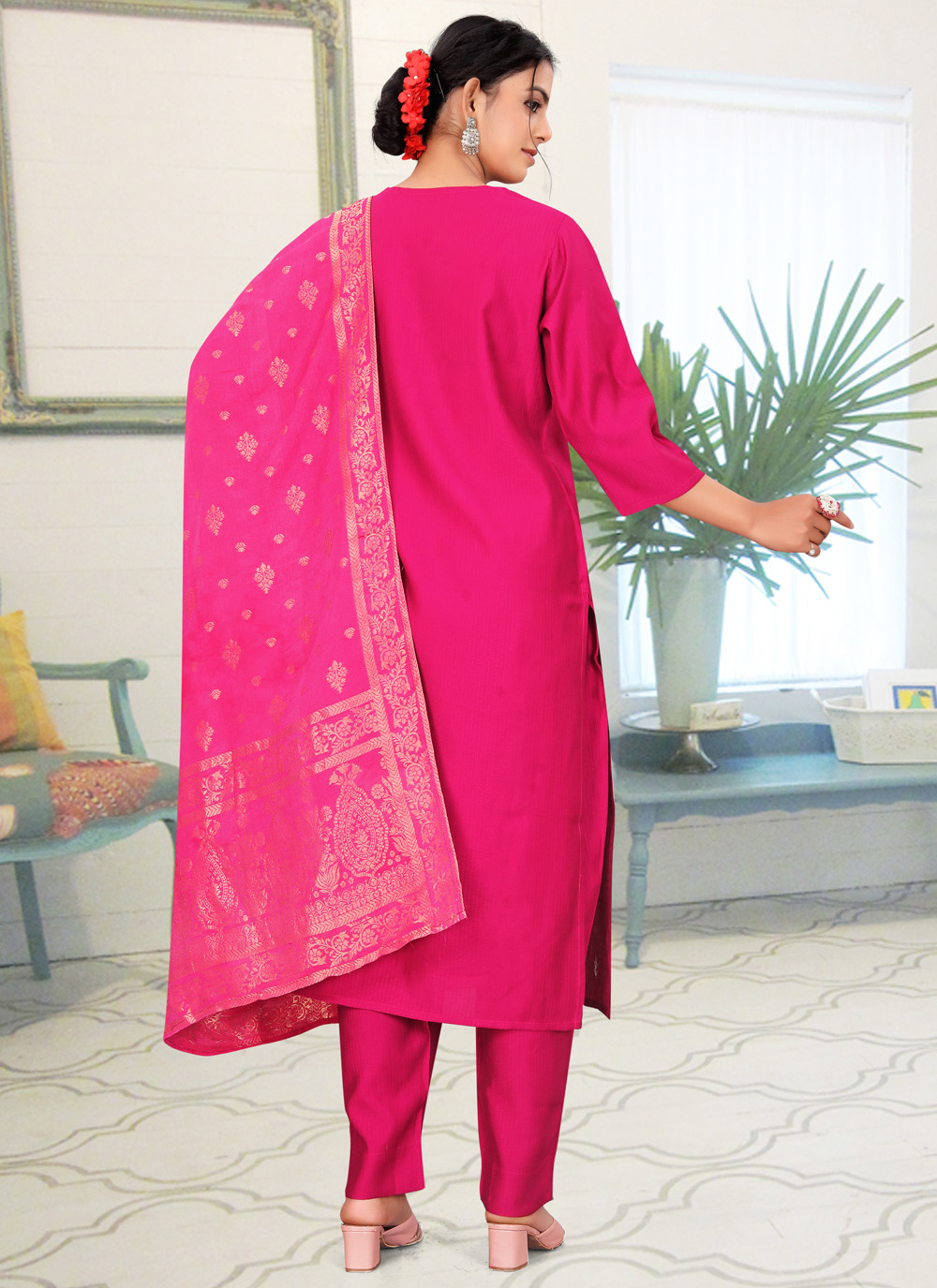 This Pink Fancy Fabric Embroidered Salwar Suit brings a trendy and elegant touch to your festive wardrobe. The soft fabric paired with delicate embroidery gives you a graceful look suitable for gatherings and cultural events. Comes with matching bottom and dupatta.