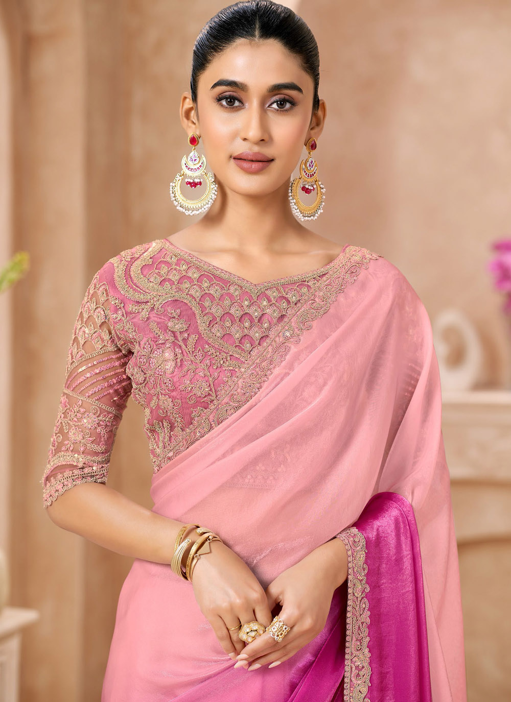 Enhance your ceremonial look with this Pink Fandy Embroidered Border Work Trendy Saree. The soft fandy fabric flows gracefully, while the detailed embroidery on the border adds a rich and elegant finish. Comes with matching blouse.
