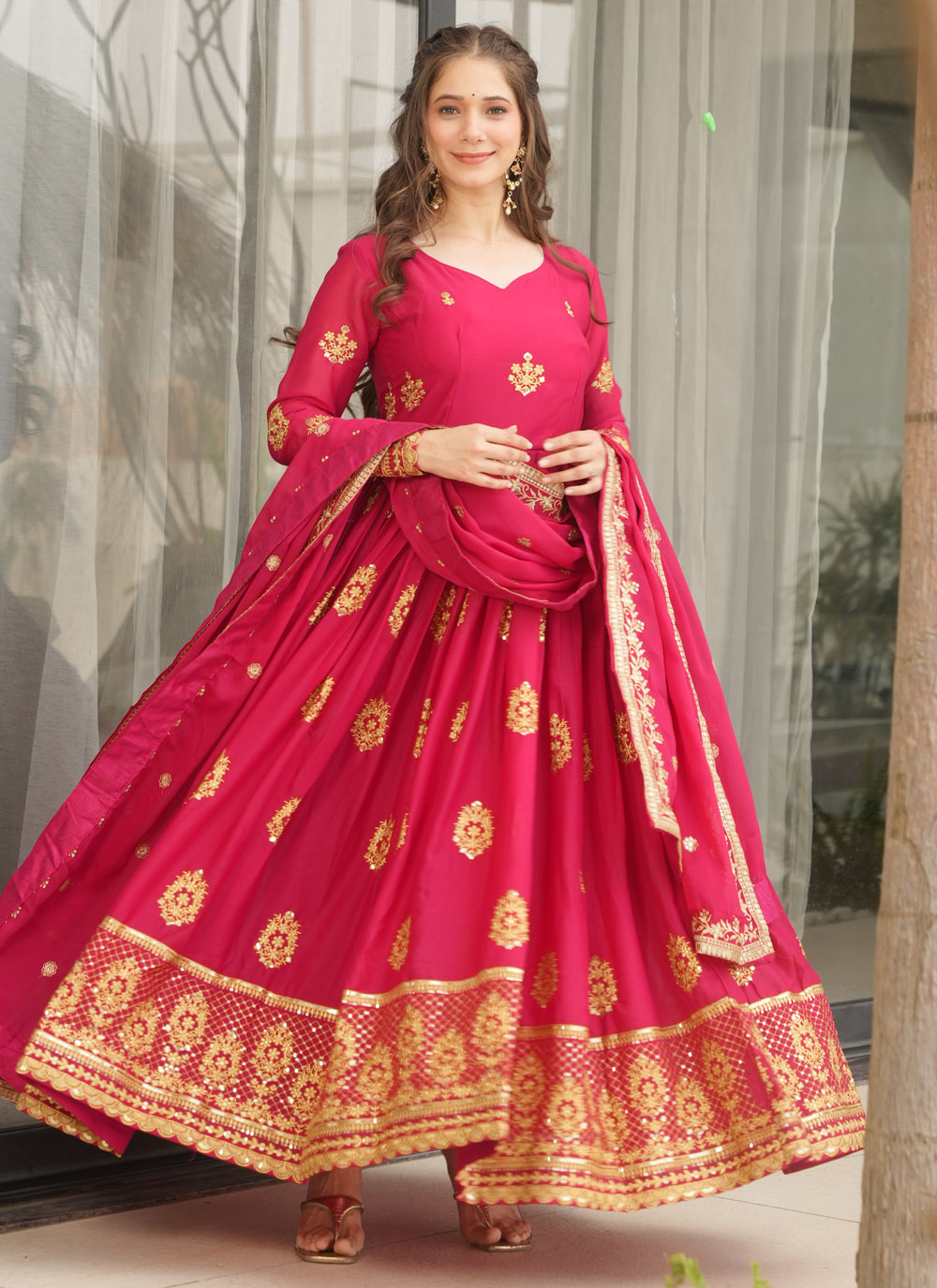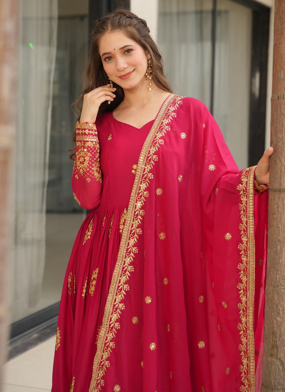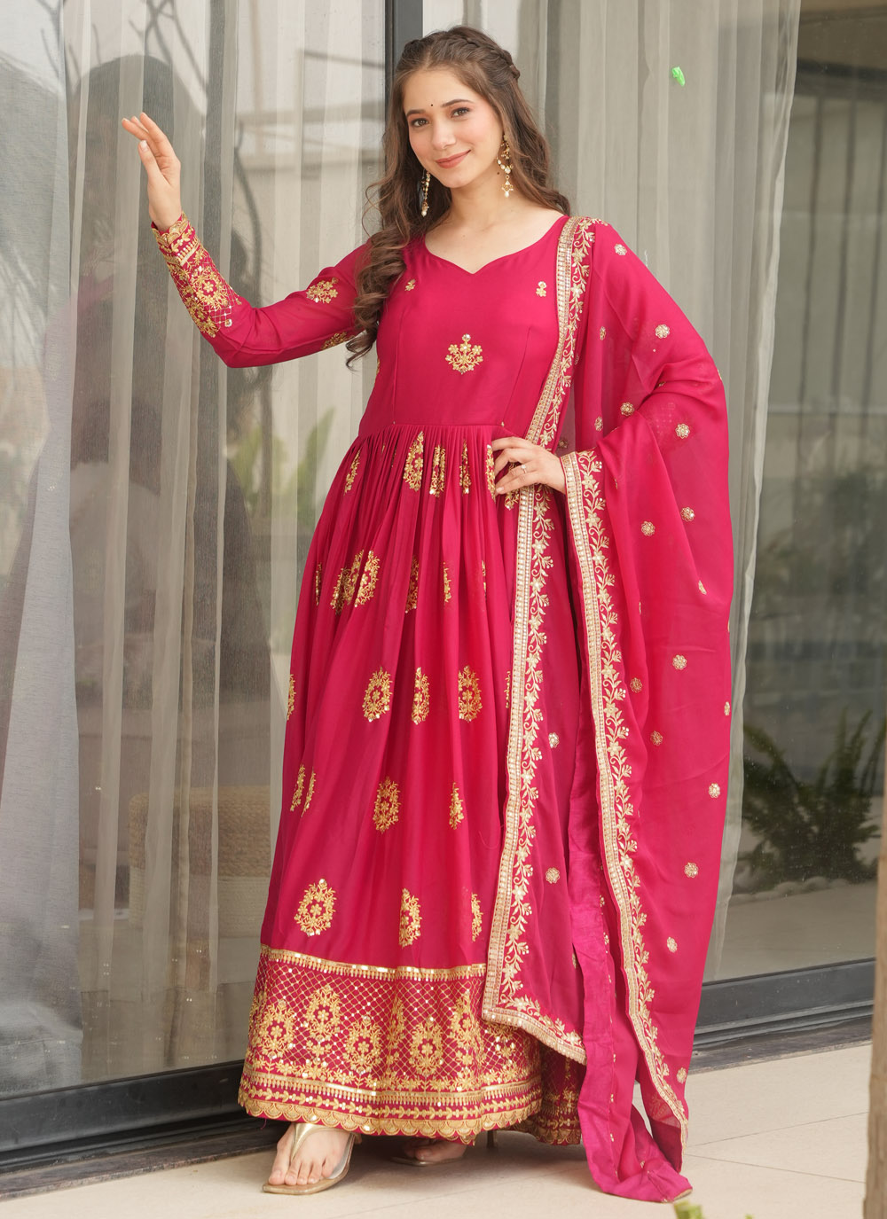 This pink embroidered gown is a celebration of grace and style. The light georgette fabric flows effortlessly, while the delicate zari and sequin detailing elevates its festive charm. Ideal for women who love a modern yet traditional blend. Comes with matching dupatta.