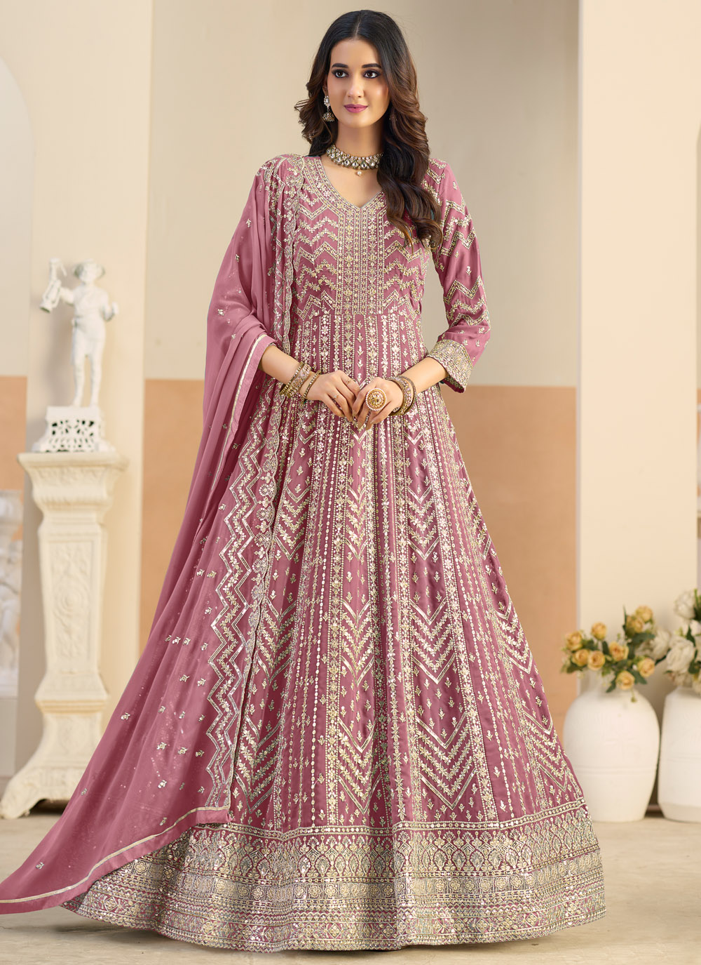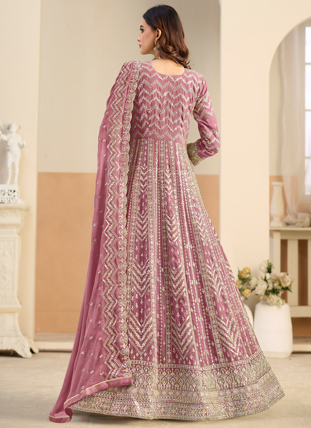 Crafted with fine faux georgette, this Anarkali suit features intricate sequins work that adds brilliance and sophistication. The soft pink color brings a feminine and stylish touch, making it suitable for festive wear and family functions. Comes with matching bottom and dupatta.