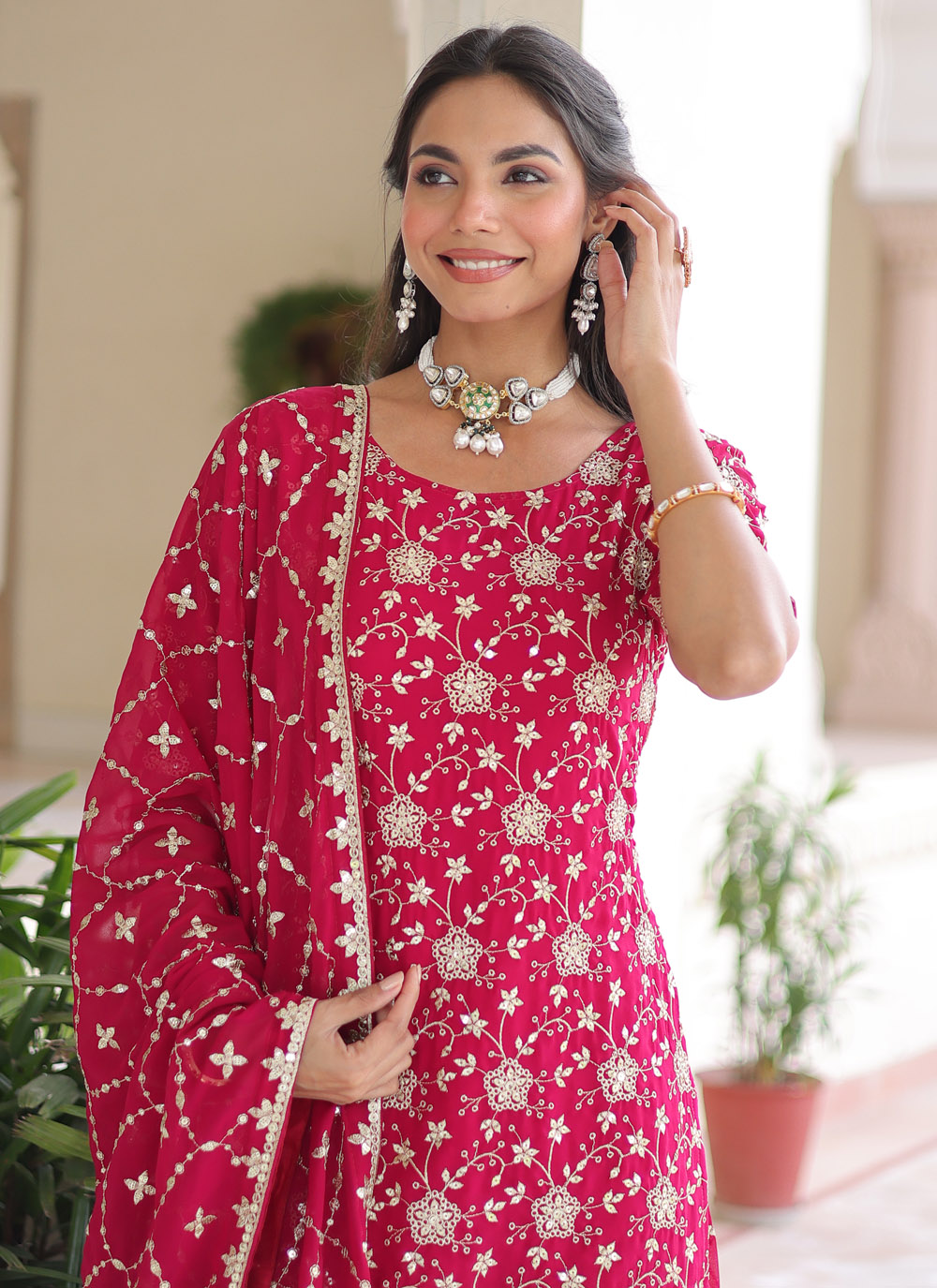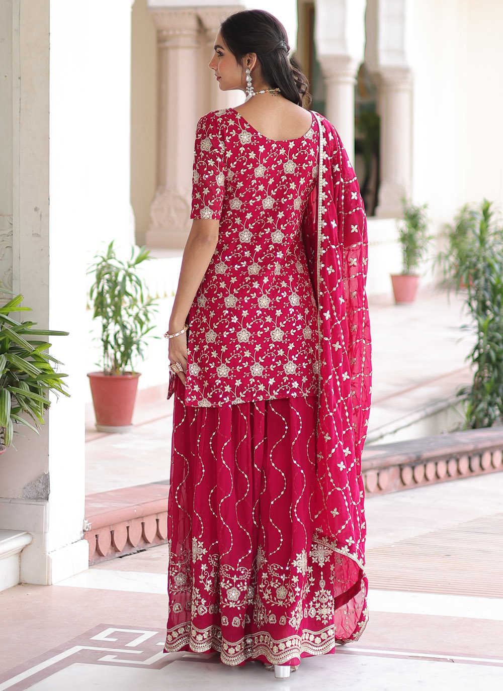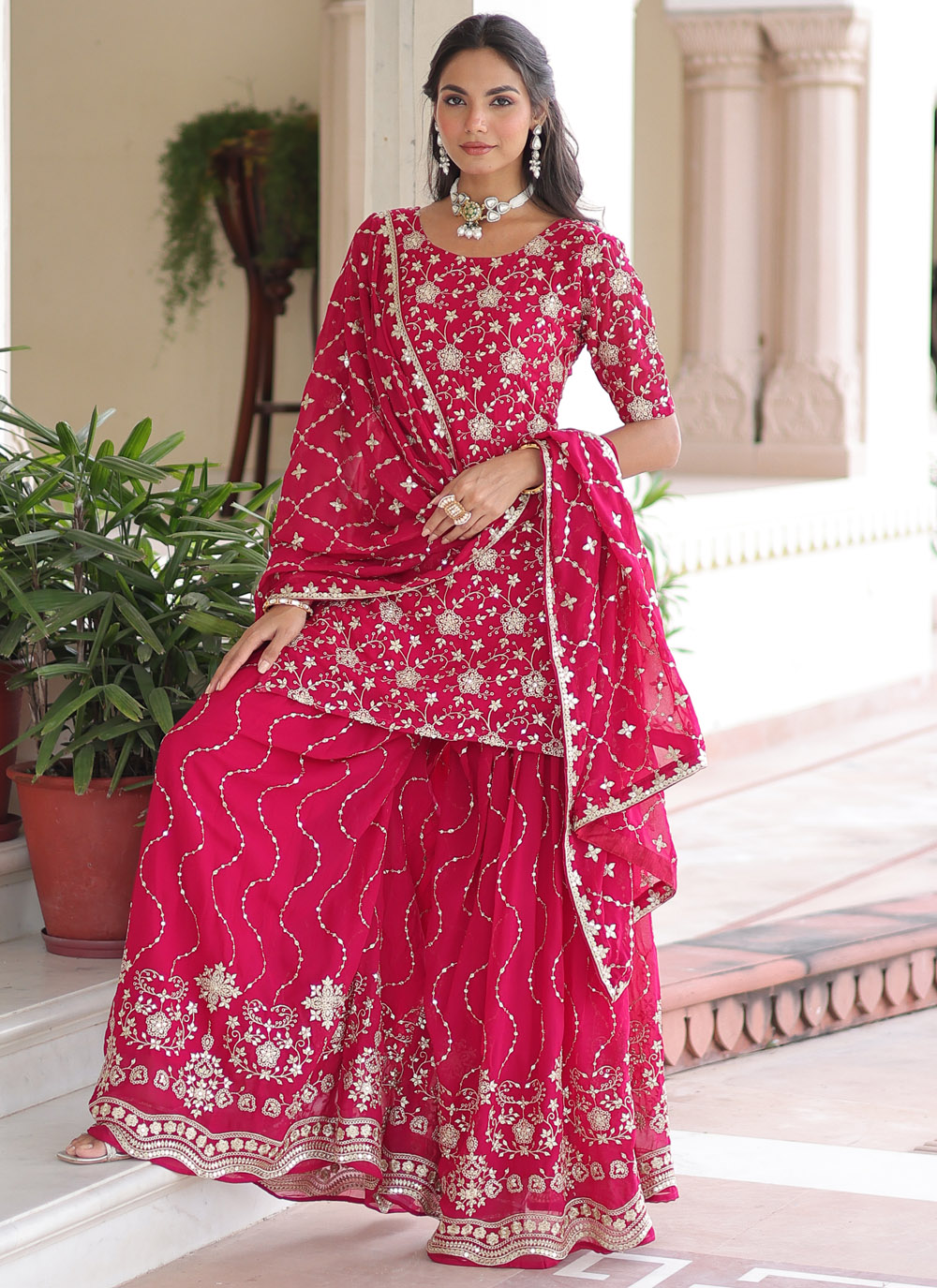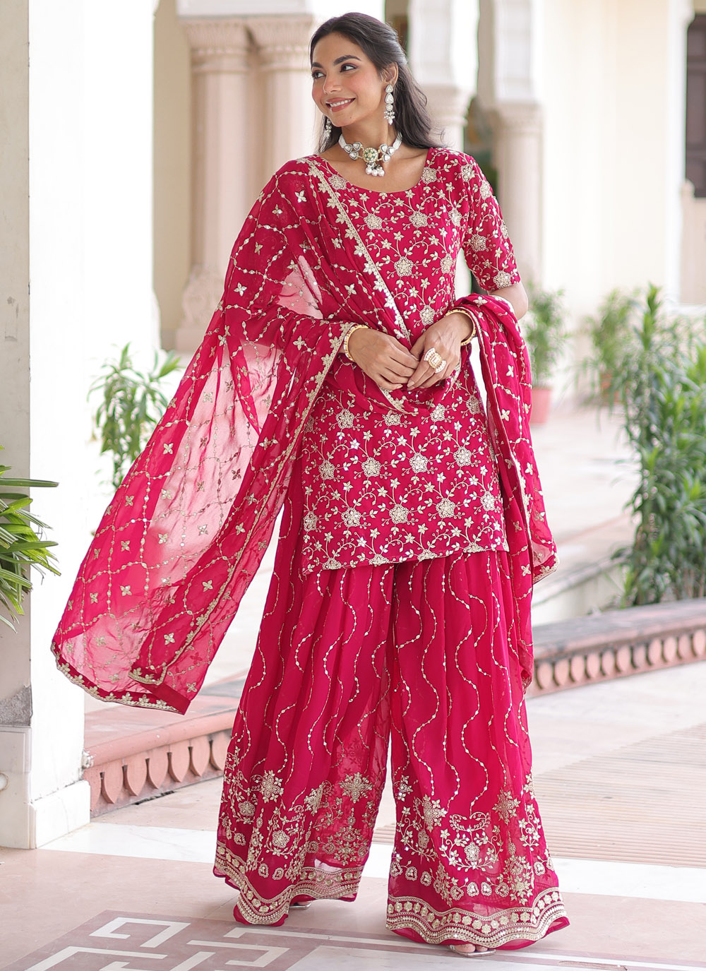This Pink Faux Georgette Sequins Embroidered Sharara Set brings effortless charm to any festive moment. The soft georgette fabric drapes beautifully, while delicate sequins add just the right sparkle for day or evening wear. Comes with matching bottom and dupatta.