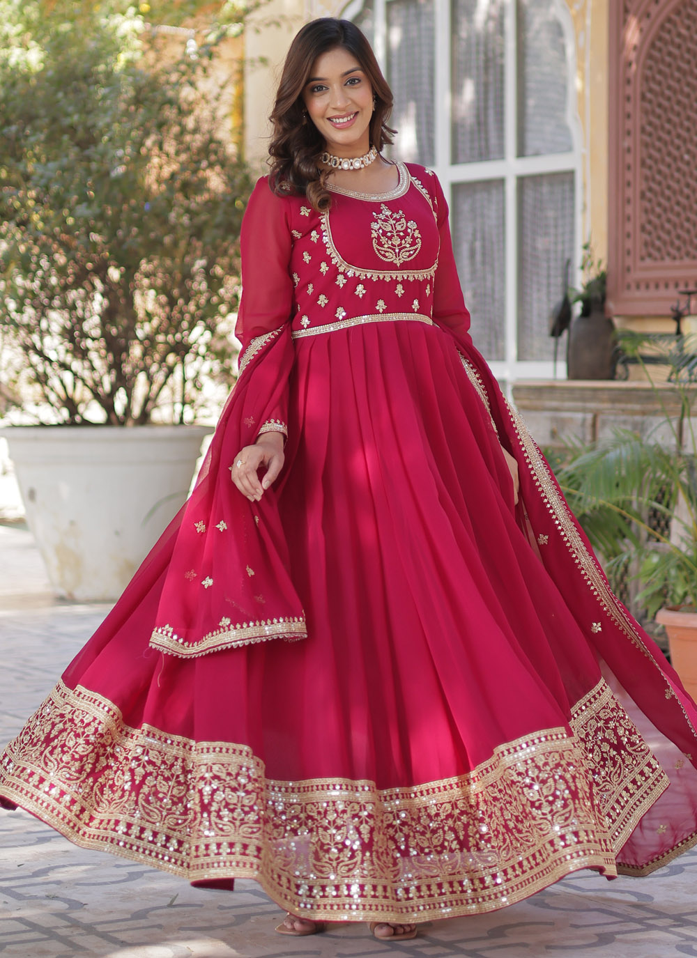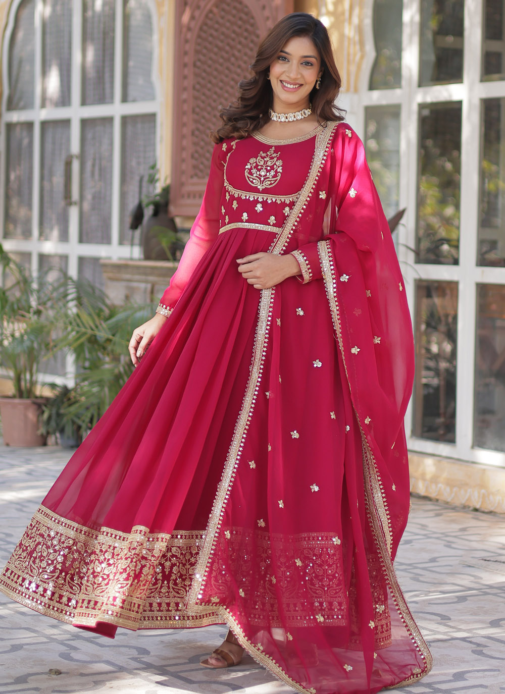 Make a dazzling statement in this Pink Faux Georgette Sequins Embroidered Trendy Gown. Designed with intricate sequin embroidery, this flowy and lightweight gown is perfect for weddings, receptions, cocktail parties, and festive occasions. Comes with matching dupatta.