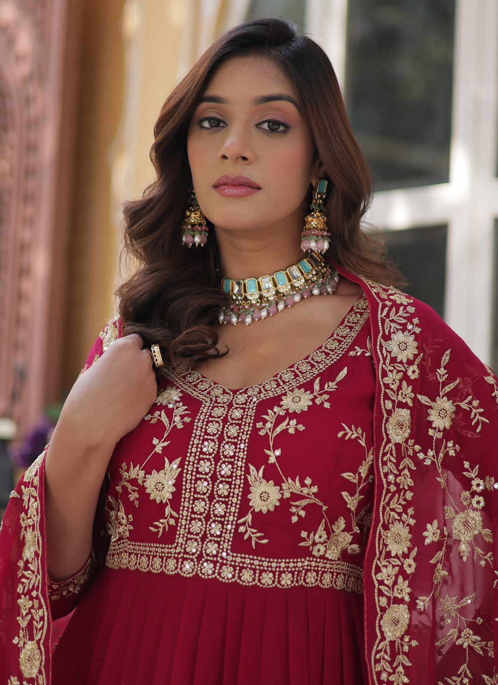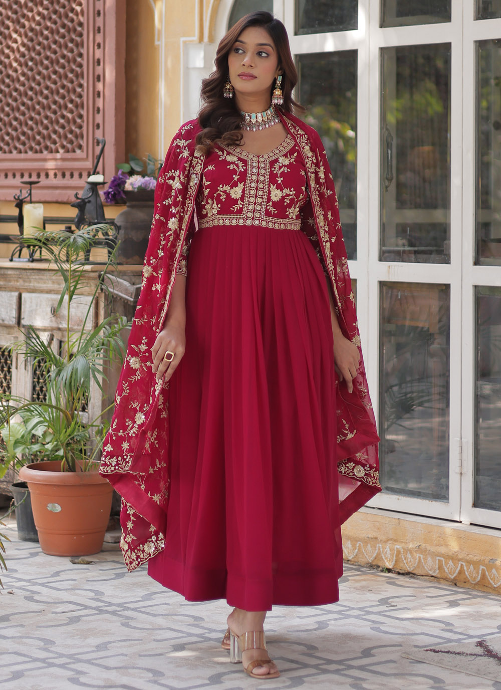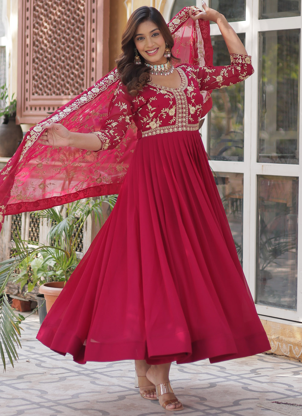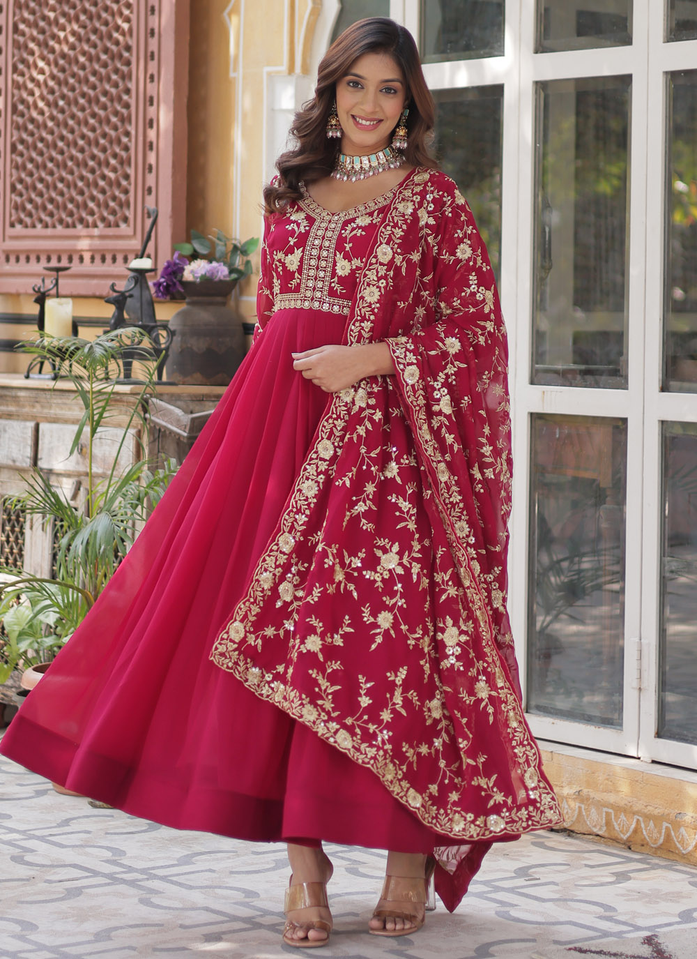 Crafted from lightweight faux georgette, this readymade pink gown features exquisite sequin detailing and intricate zari work, making it an effortless choice for weddings, sangeets, and evening events. Comes with matching dupatta.