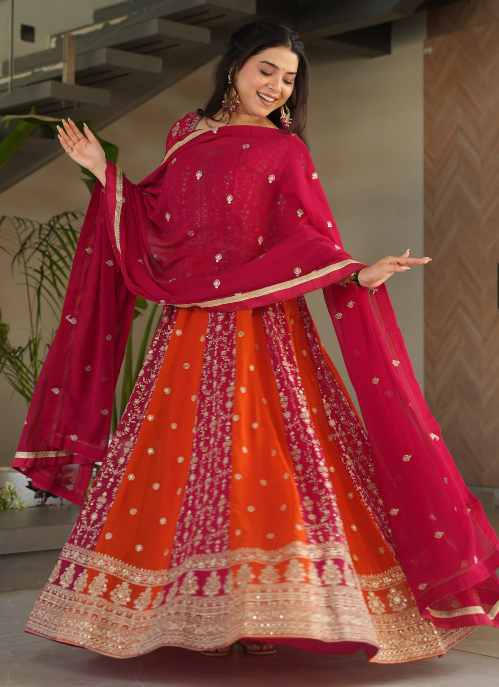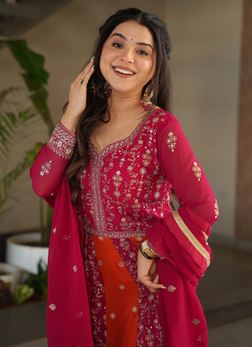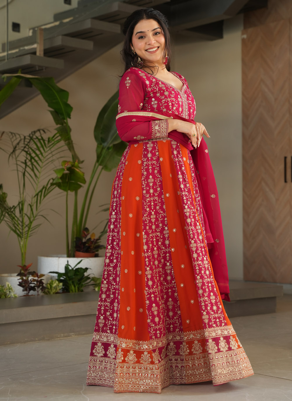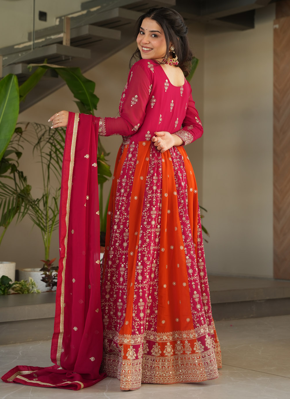 Elevate your celebration style with this elegant pink embroidered gown in faux georgette. Embellished with shimmering sequins and detailed zari work, it exudes charm and sophistication—ideal weddings, receptions and festivals. Comes with matching dupatta.