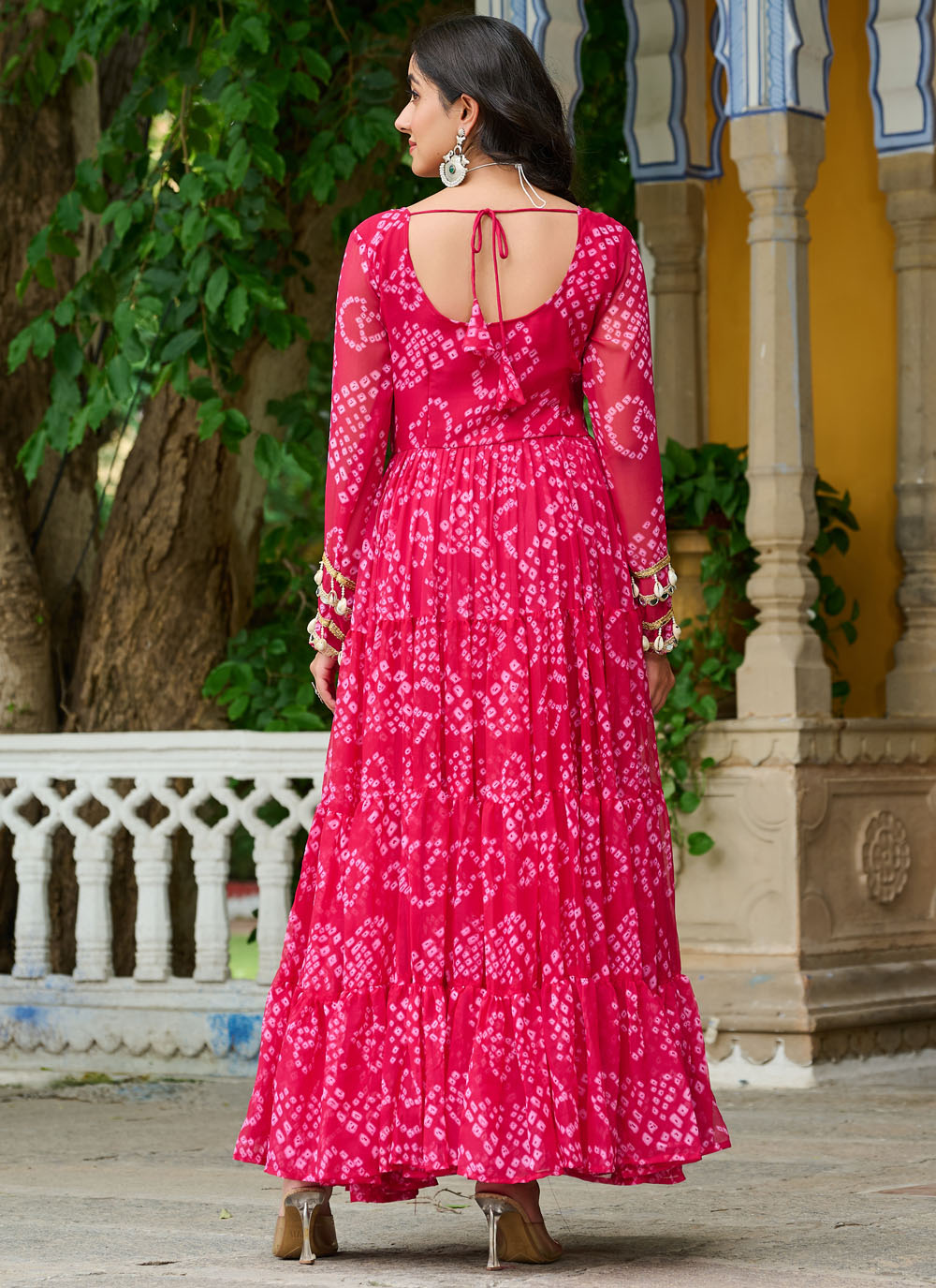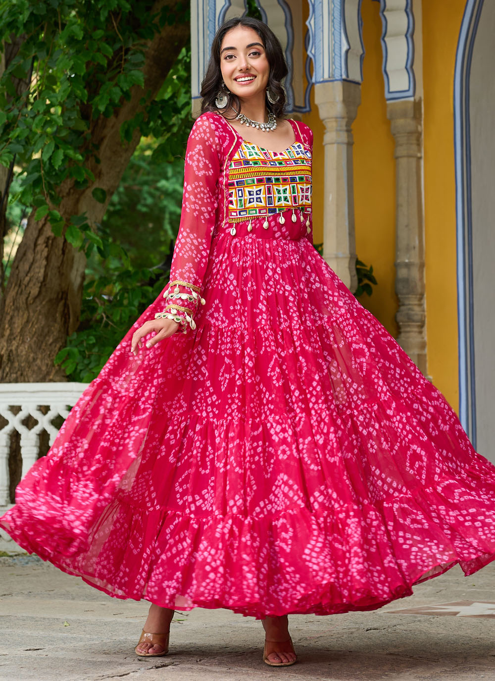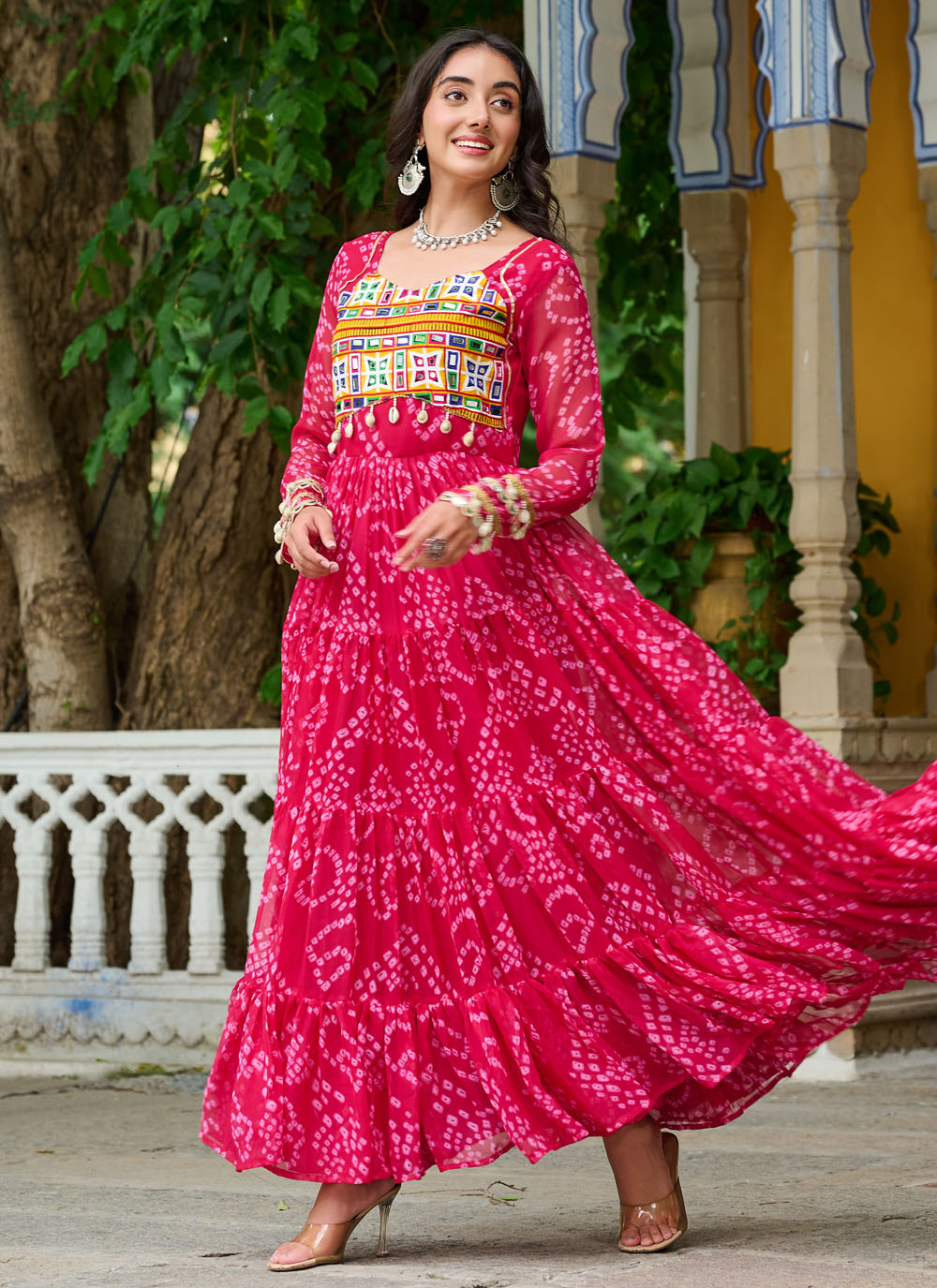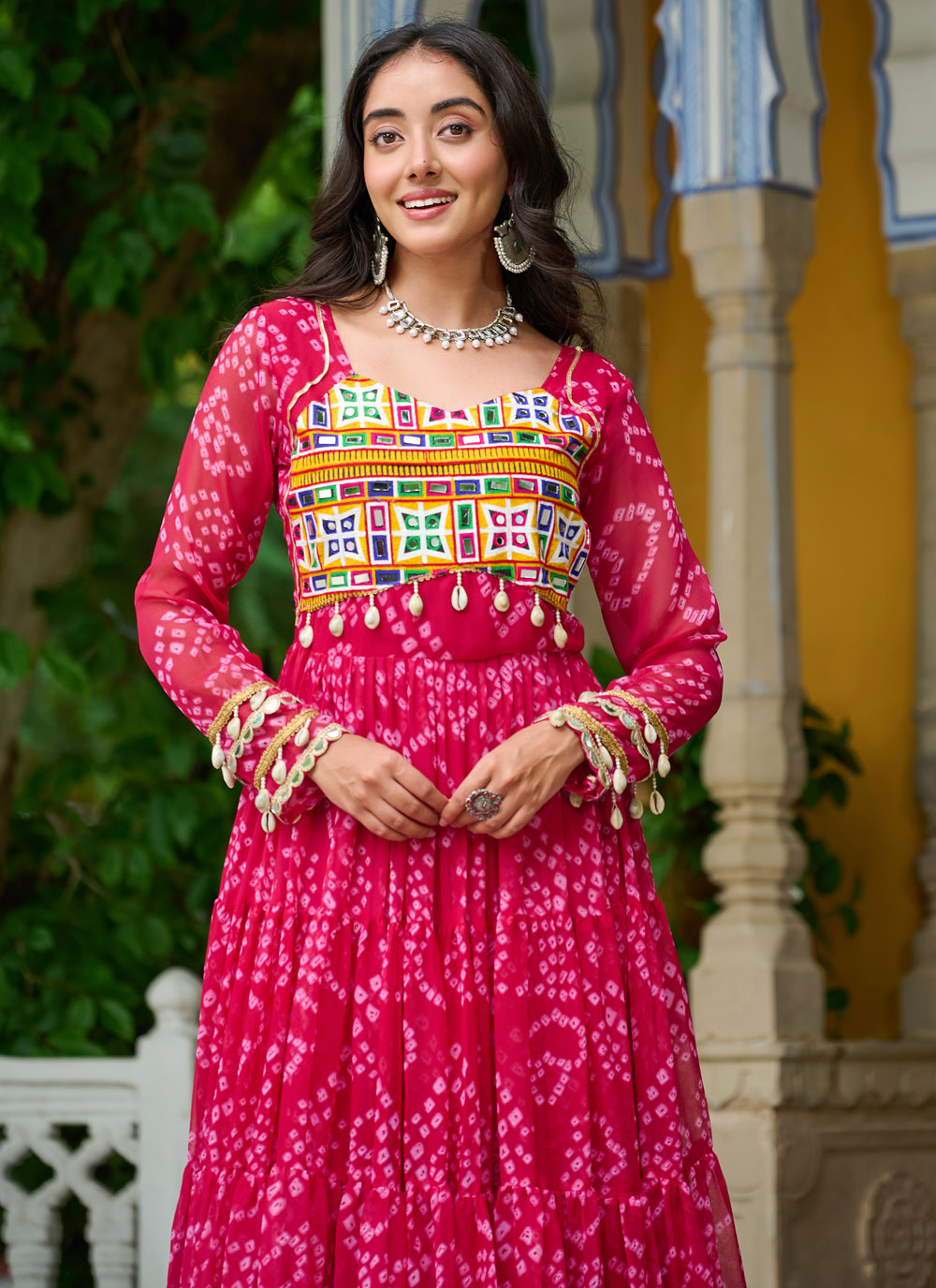 Add a touch of folk charm to your festive wardrobe with this Pink Faux Georgette Gown, adorned with colorful Gamthi patch work and vibrant traditional prints. Light, breezy, and full of cultural flair.