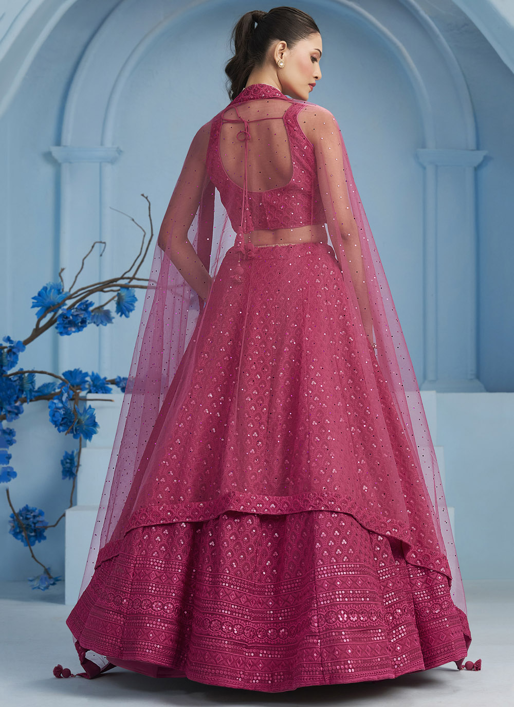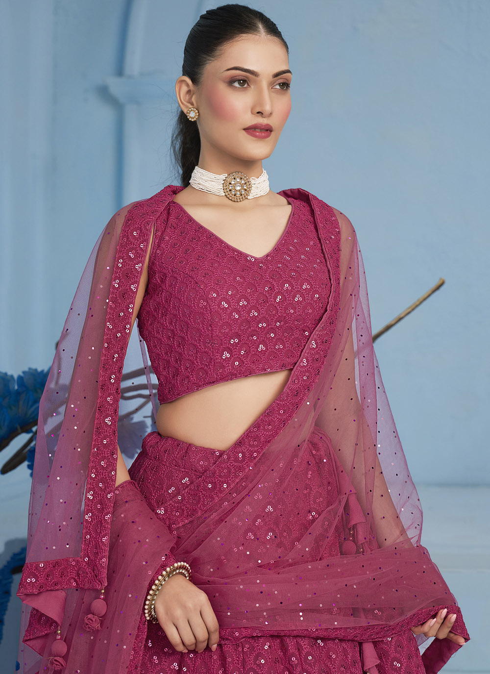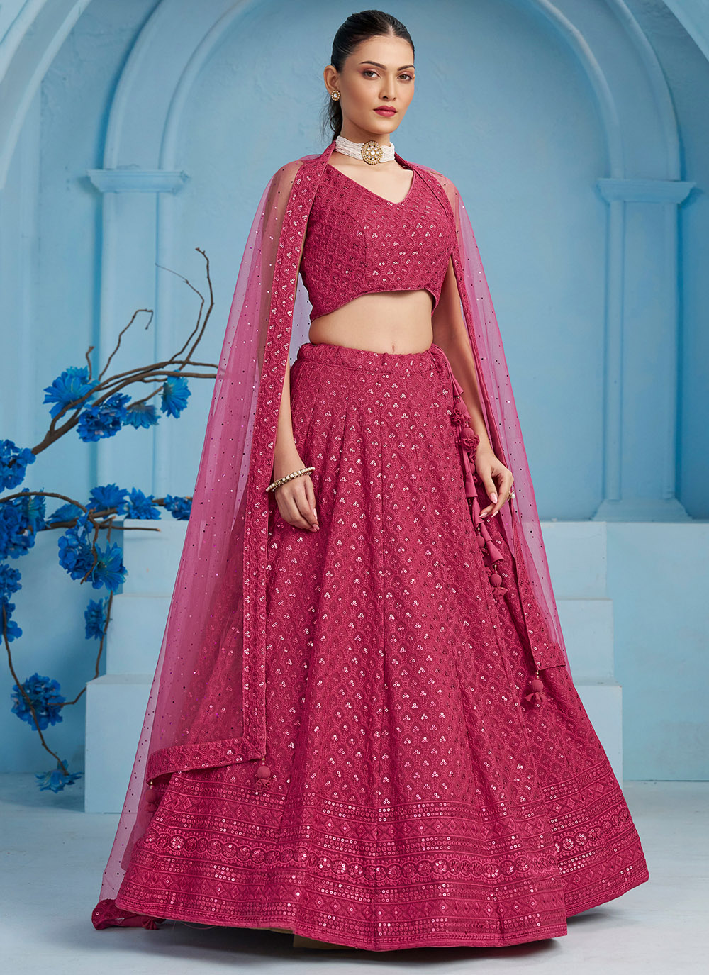 Crafted in flowy georgette, this Pink Lehenga Choli features fine thread and sequin embroidery that adds just the right touch of glamour. The lightweight fabric ensures comfort while giving you that dreamy bridal glow. Comes with matching choli and dupatta.