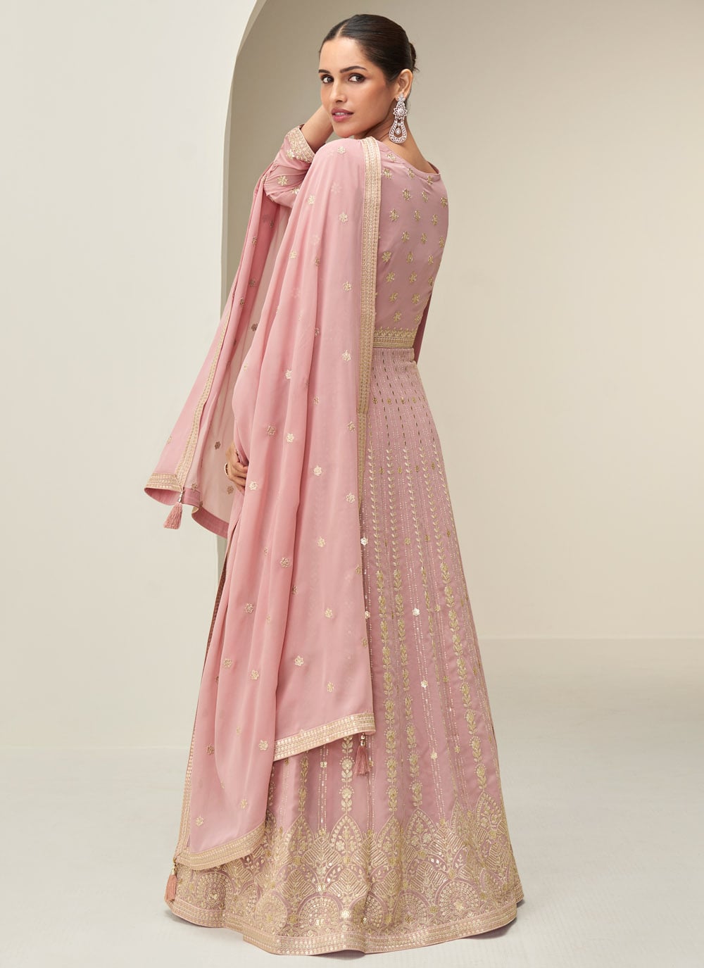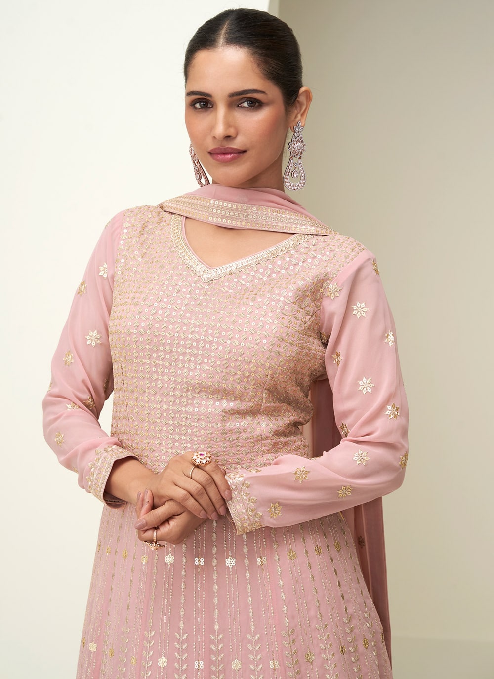 Flaunt elegance with this Pink Georgette Readymade Designer Gown, beautifully enhanced with shimmering sequin embroidery. Its flowing silhouette and soft fabric make it a perfect choice for receptions, engagements, and festivals. Comes with matching dupatta.