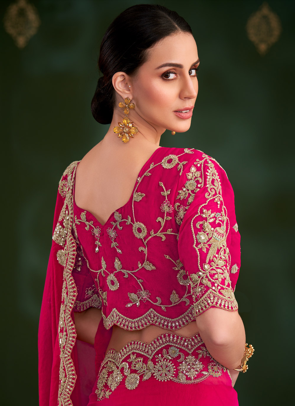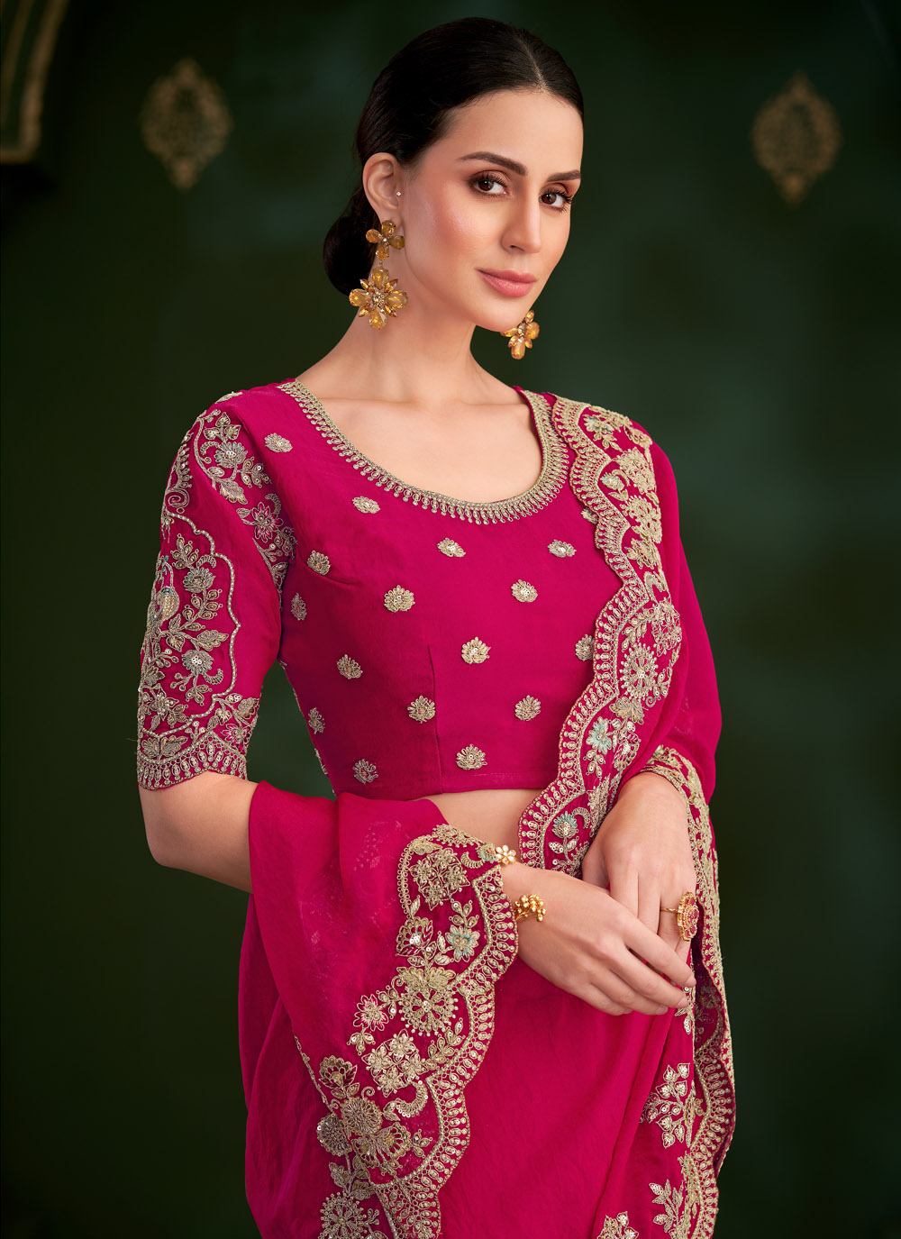 This pink georgette silk saree offers a soft and elegant drape that instantly elevates your festive wardrobe. The embroidery work is arranged to highlight the borders and pallu, creating a balanced and tasteful design. Comes with matching blouse.