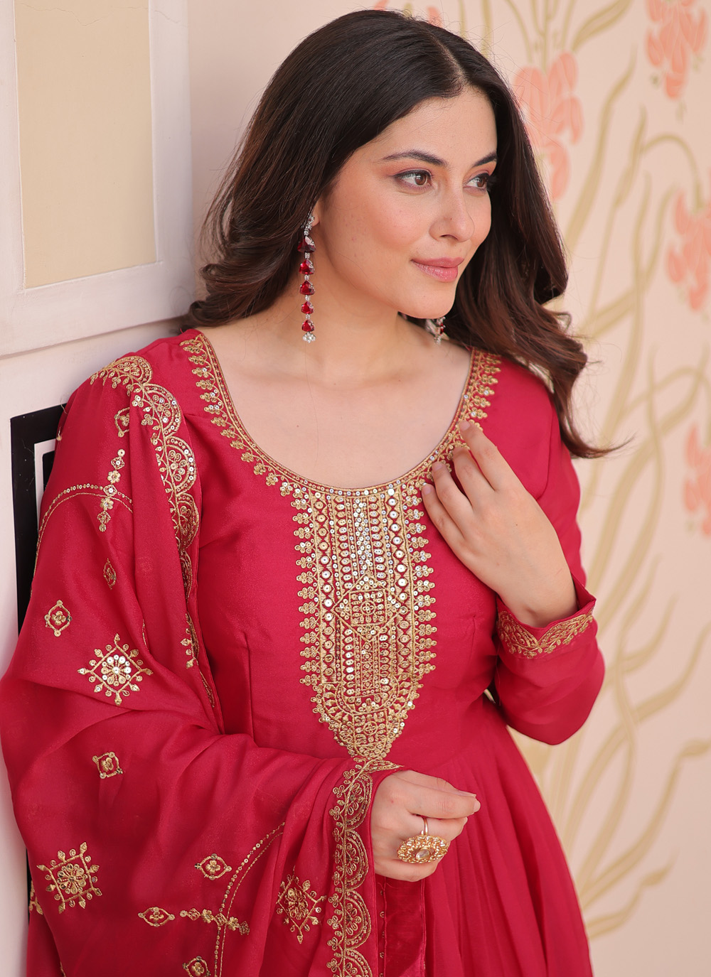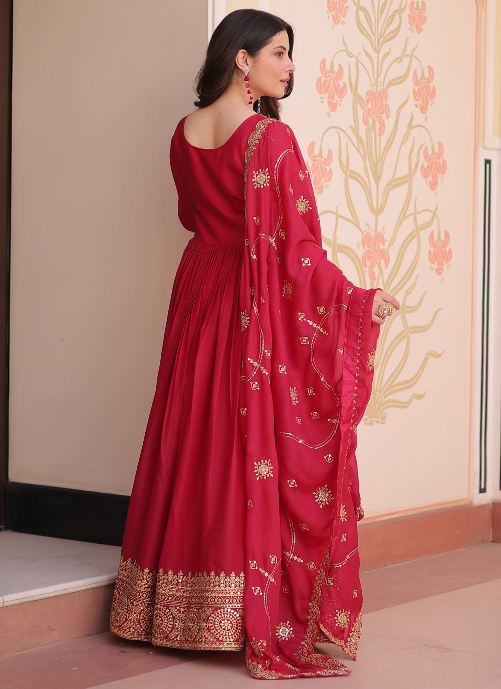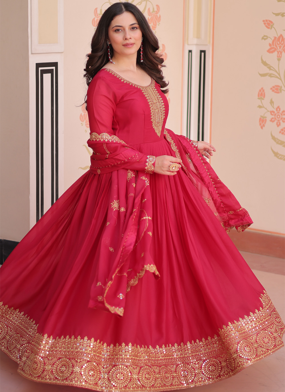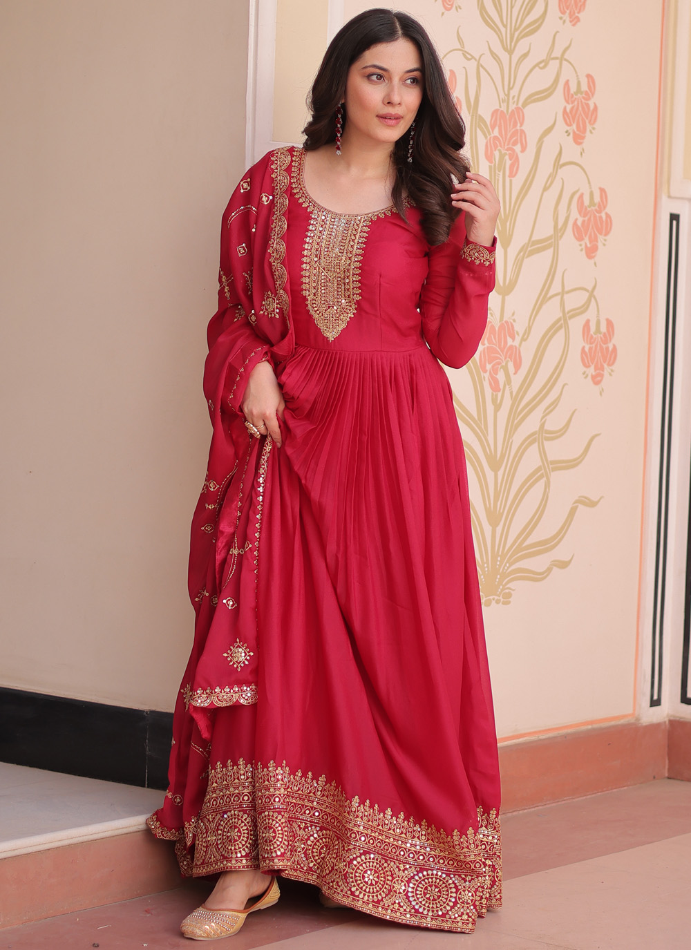 This pink georgette gown captures attention with its rich zari and sequins embroidery. Designed with a flowy silhouette, it blends modern charm with traditional detailing, making it an effortless choice for festive occasions and family celebrations. Comes with matching dupatta.