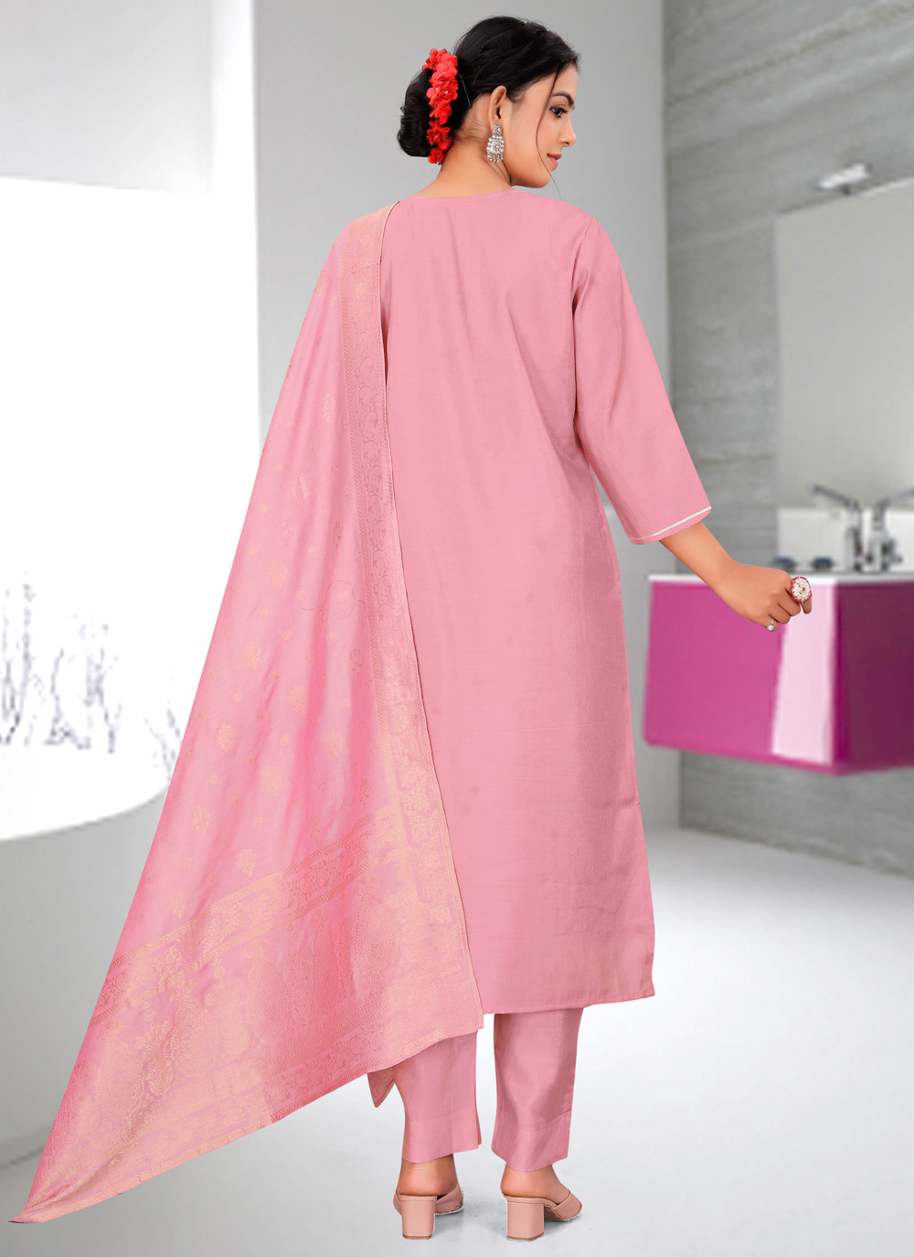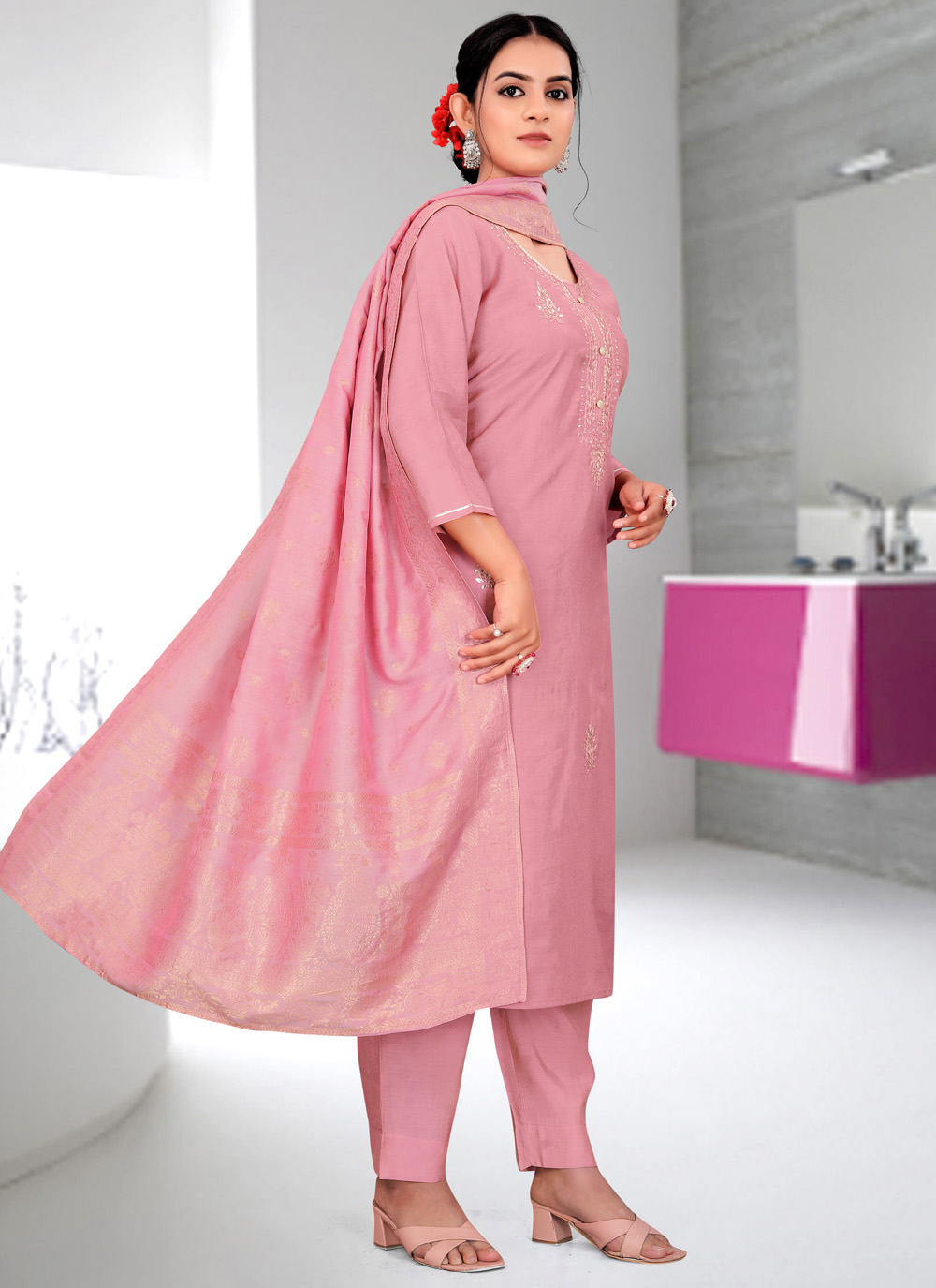 Designed for effortless styling, this pink readymade salwar kameez features fine hand embroidery on premium Muslin fabric. It delivers a classy yet simple festive look suitable for both everyday wear and special moments. Comes with matching bottom and dupatta.