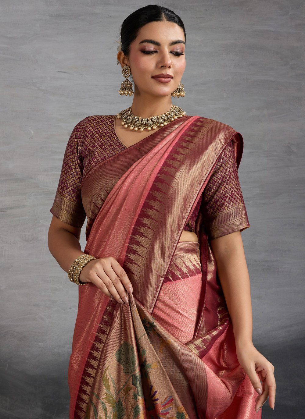 This traditional pink Kanjivaram silk saree is enhanced with zari weaving and meenakari work. The combination of color and woven designs makes it a simple yet attractive ethnic choice. Comes with matching blouse.