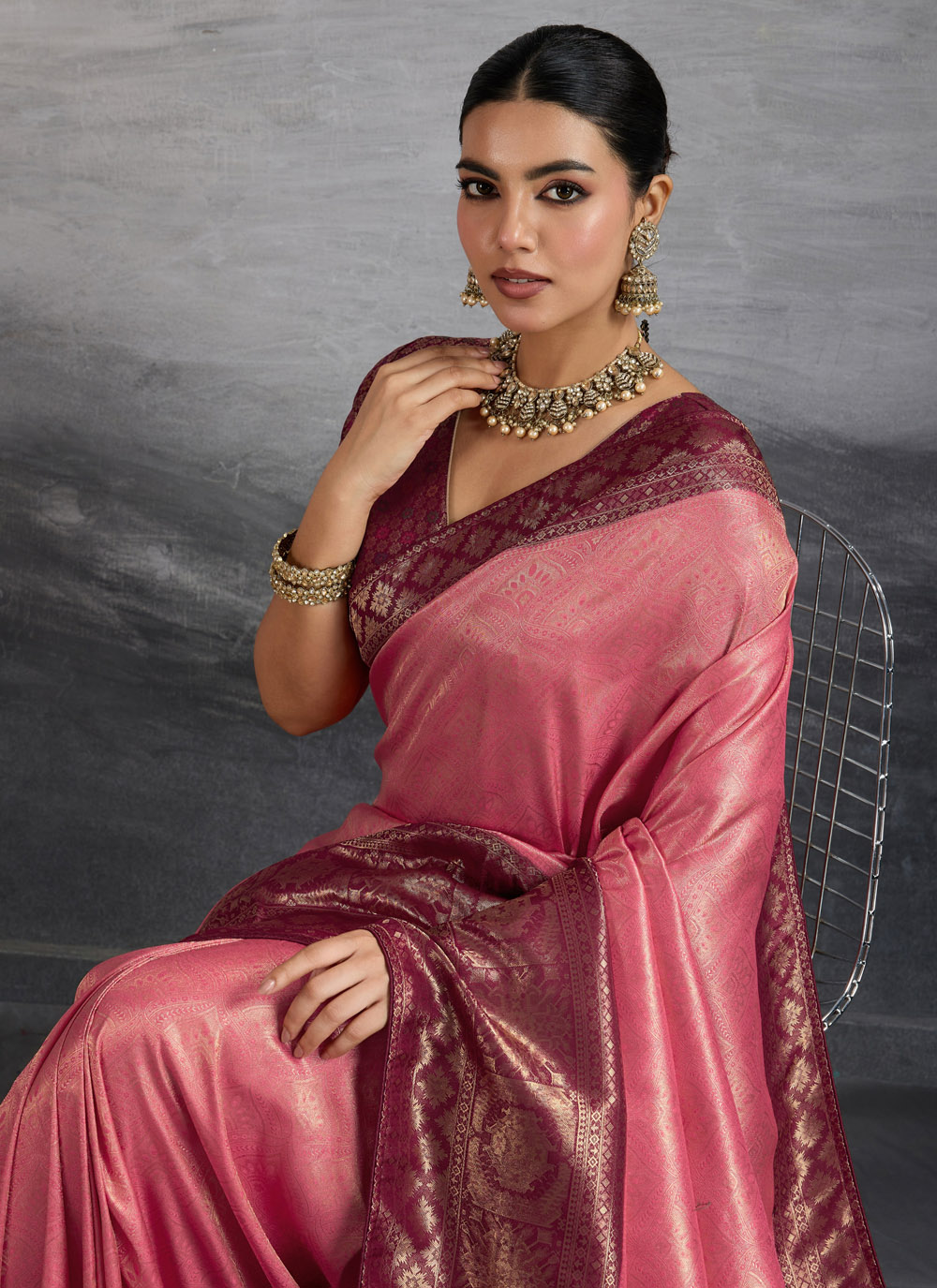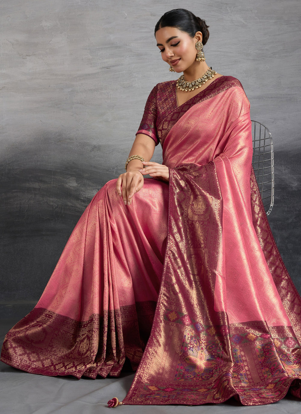 Celebrate timeless artistry in this pink Kanjivaram silk saree featuring exquisite Meenakari woven patterns paired with heritage zari detailing. The vibrant pink tone adds a contemporary twist to classic craftsmanship, making this saree a standout choice for festive occasions. Comes with matching blouse.