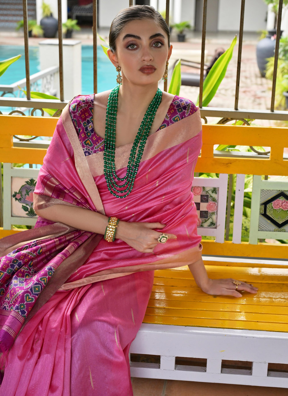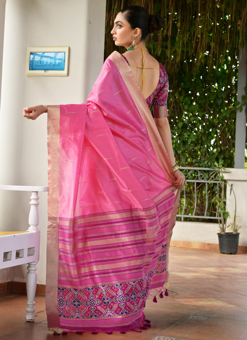 Add a touch of elegance to your party wardrobe with this beautifully crafted pink khadi silk saree. The delicate weaving work and soothing color offer a refined ethnic look suitable for social events. Comes with matching blouse.