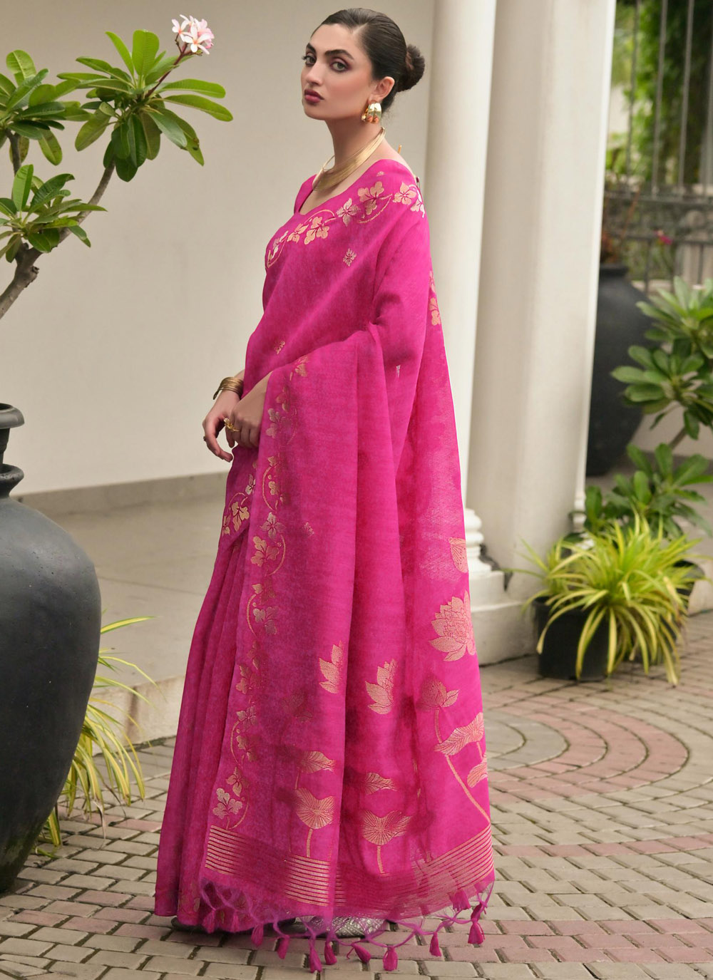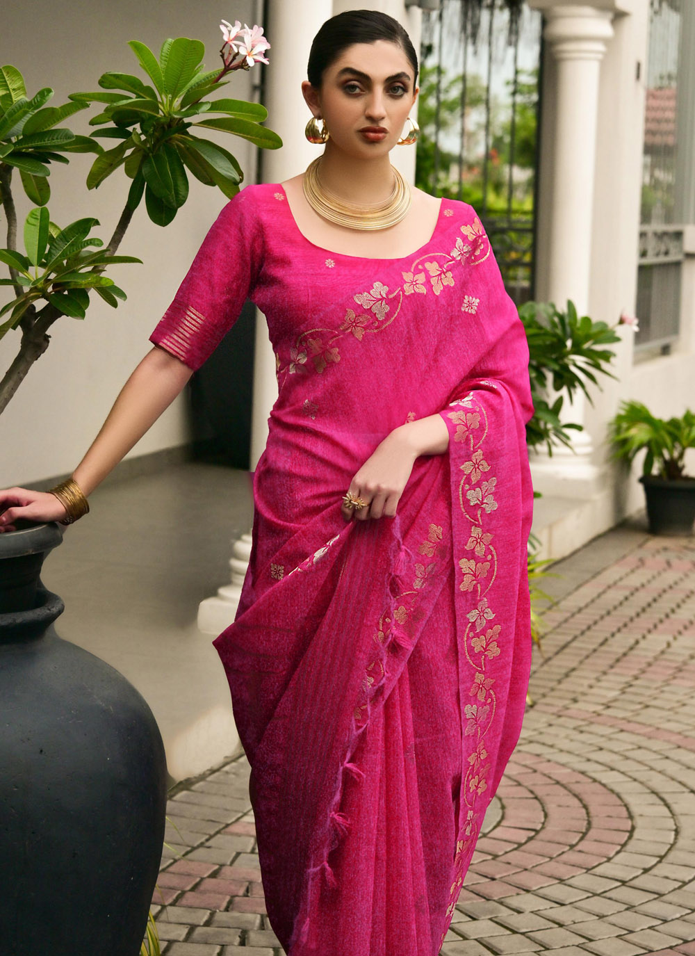 Radiate festive charm with this Pink Linen Silk Zari Weaving Work Festival Trendy Saree, beautifully crafted for elegant occasions. The premium linen silk fabric offers a soft and breathable feel, while the fine zari weaving introduces a touch of traditional richness. Comes with matching blouse.