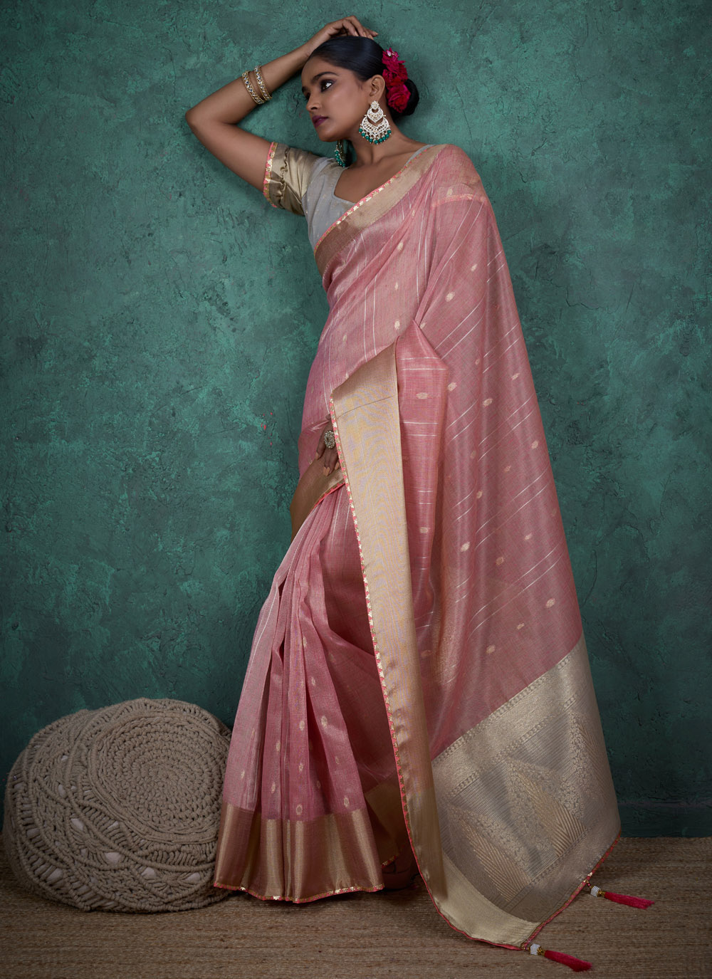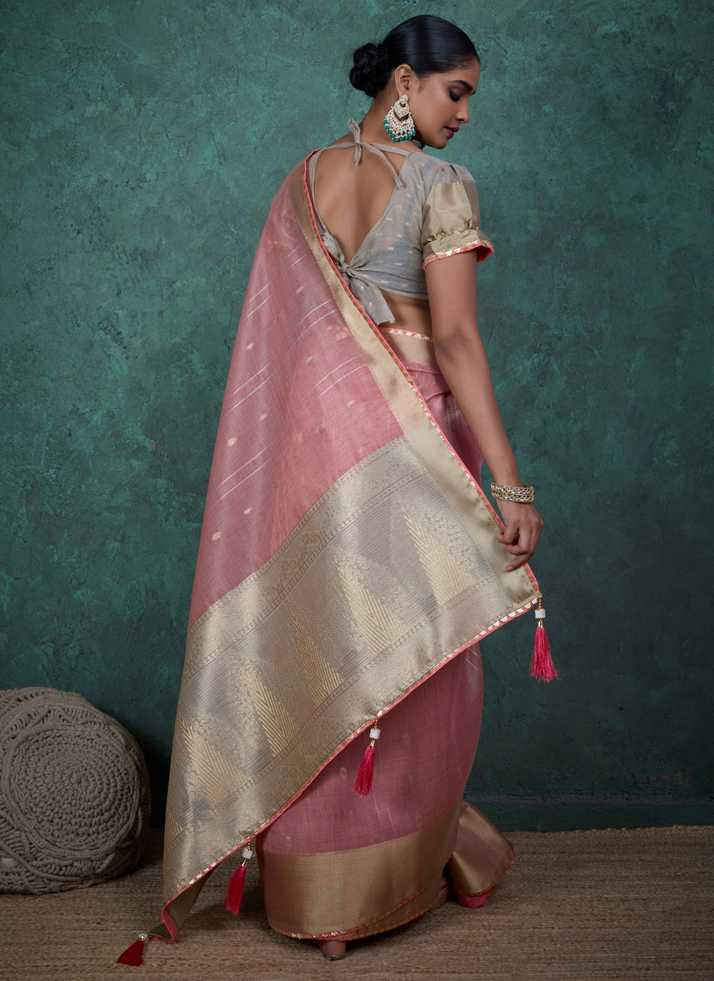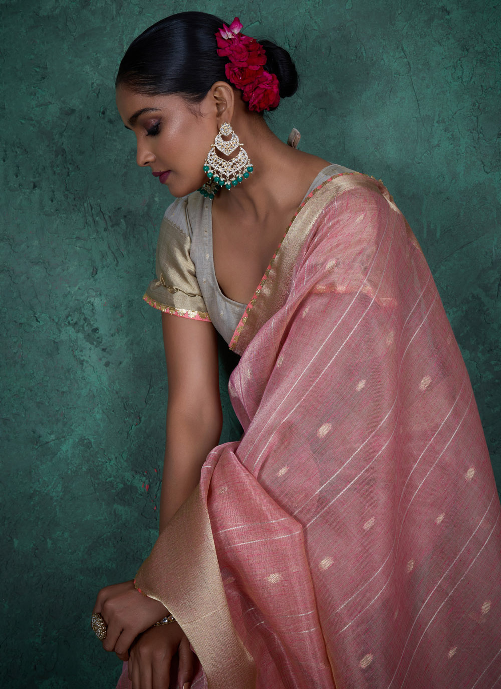 Crafted for the modern woman who appreciates heritage, this classic pink saree boasts intricate zari woven designs on premium linen. It drapes effortlessly and adds a graceful flair to occasions. Comes with matching blouse.