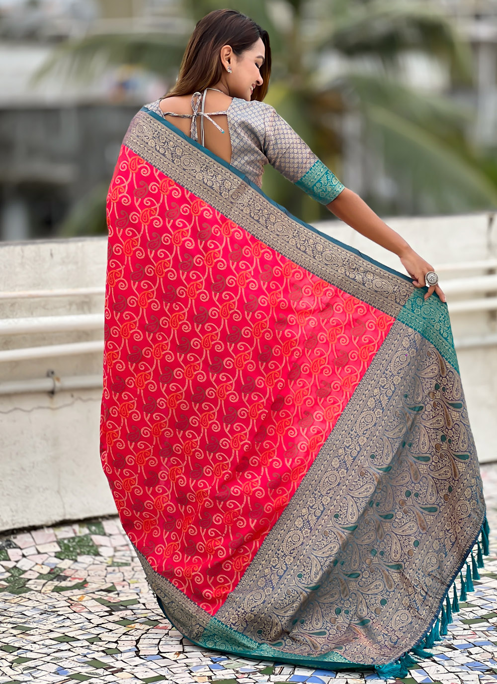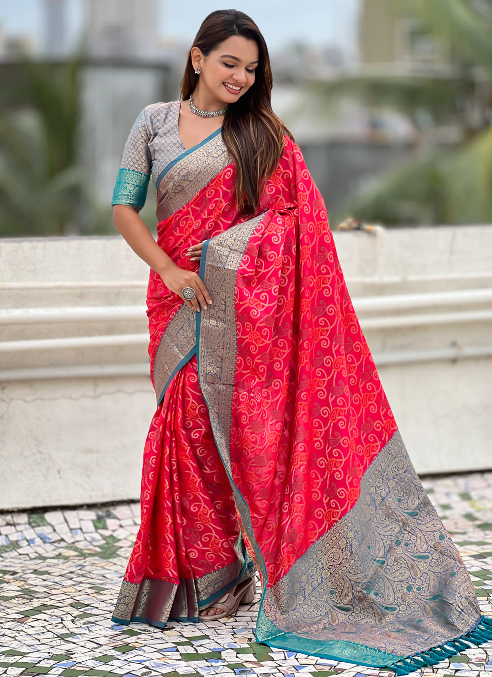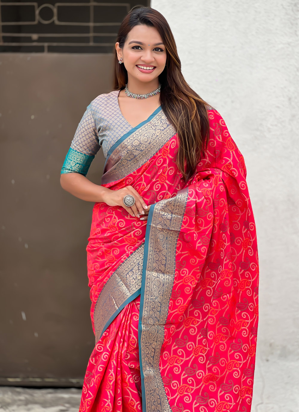 This festive Pink silk saree beautifully blends traditional meenakari artistry with contemporary fashion. The intricate work adds depth and elegance, while the flowing silk fabric creates a flattering silhouette. Comes with matching blouse.