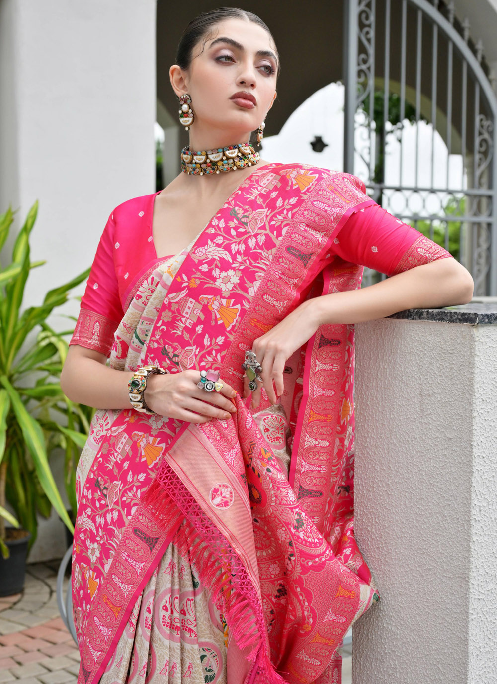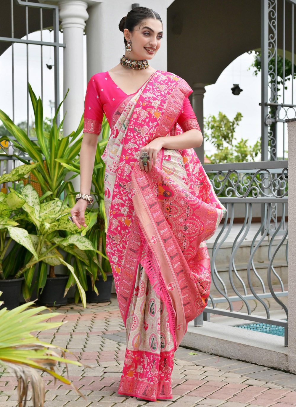 Enhance your ethnic wardrobe with this pink Banarasi silk saree featuring detailed Meenakari zari work. The premium silk construction provides a soft and flowing silhouette, while the intricate zari patterns create a sophisticated and eye-catching look. Comes with matching blouse.