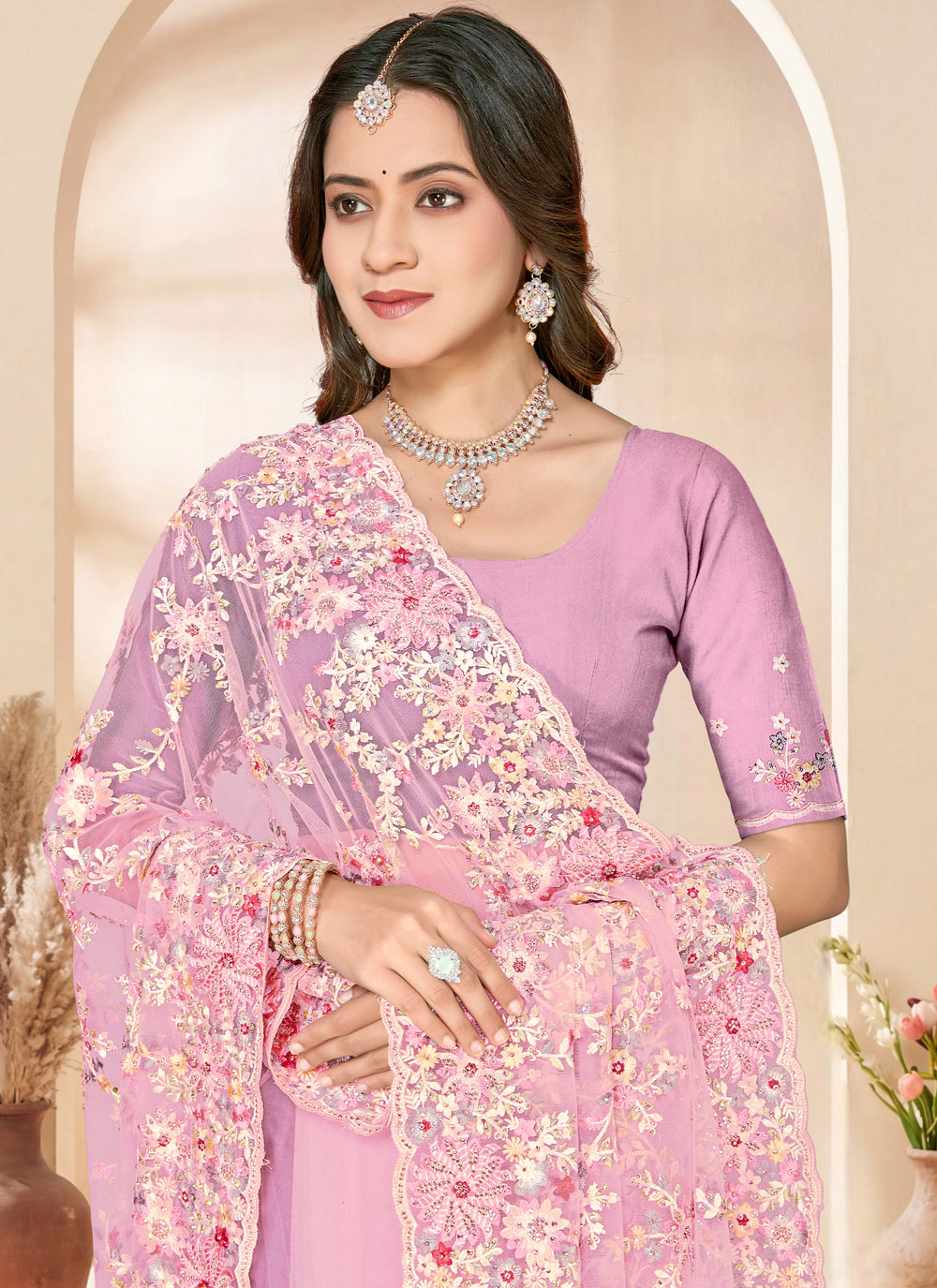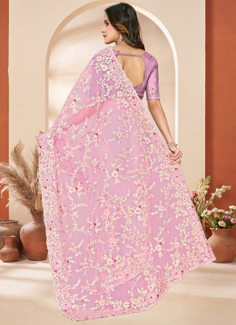This pink engagement saree in net showcases fine resham embroidery paired with shimmering zarkan and stone work for a graceful and glamorous look. Comes with matching blouse.