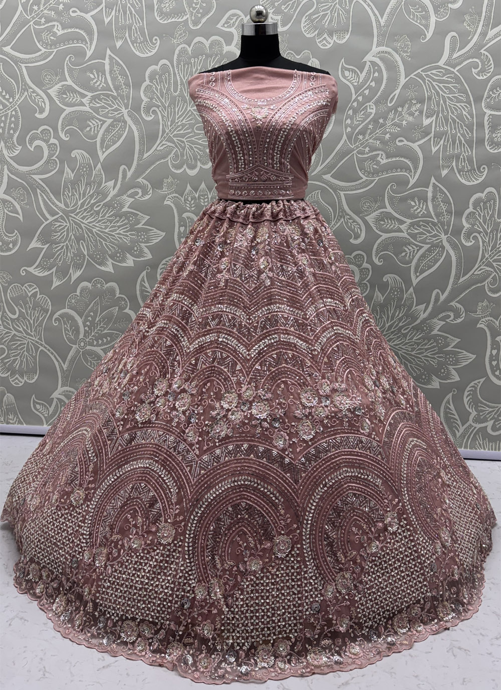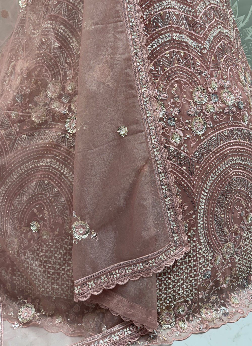 Turn heads at your engagement ceremony with this Pink Net Lehenga Choli featuring intricate sequins, beadwork, thread embroidery, zarkan, and diamond detailing. The flowy net lehenga paired with a finely embroidered choli offers a dreamy and elegant look. Comes with matching choli and dupatta.