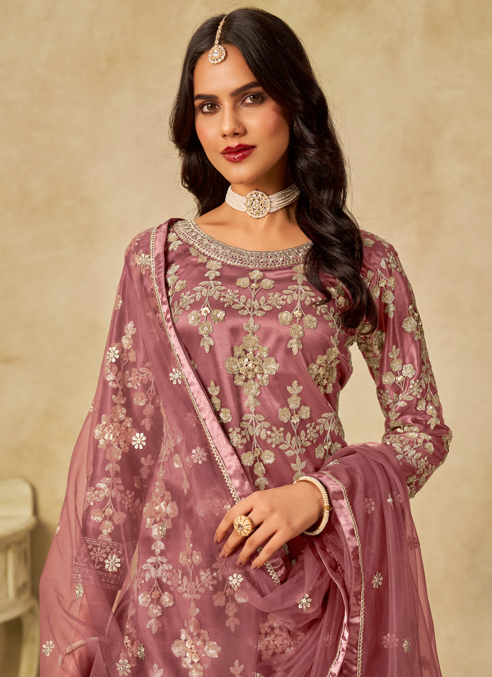 Crafted for women who love refined style, this designer salwar suit in pink net is adorned with sequins and fine resham embroidery. The lightweight fabric and exquisite detailing make it a chic ensemble for festive gatherings or traditional events. Comes with matching bottom and dupatta.