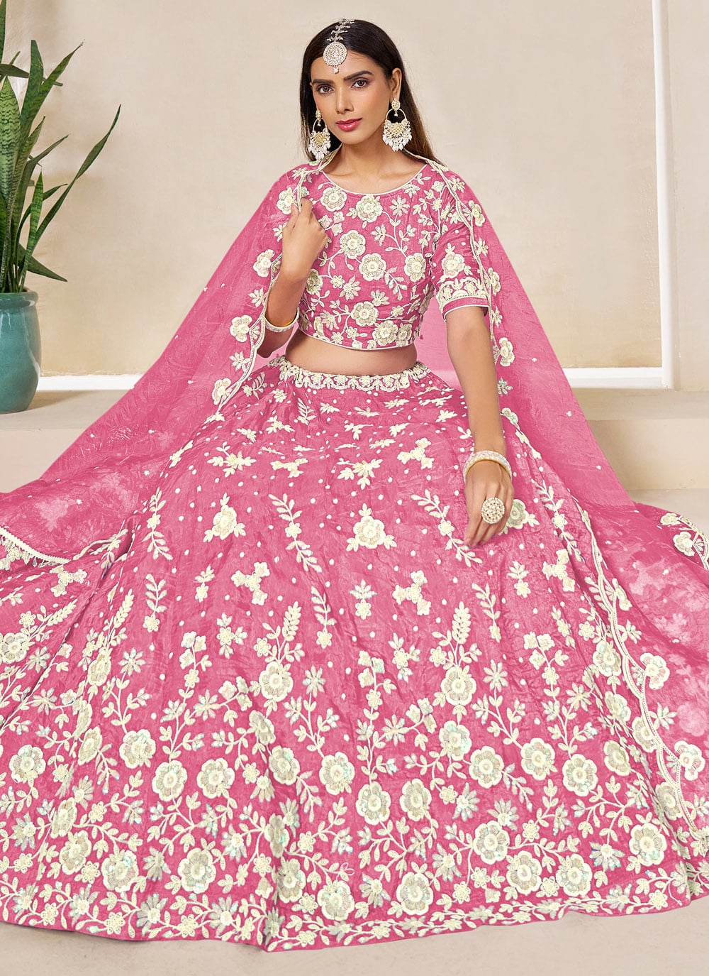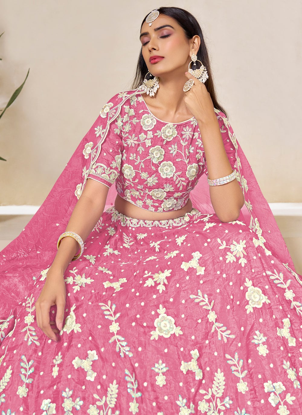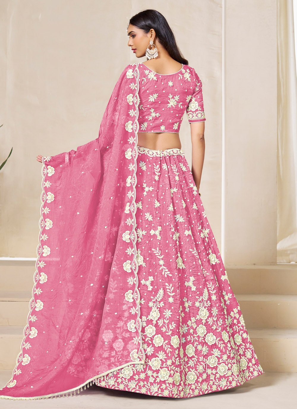 Celebrate your special day in sheer elegance with this pink organza crush lehenga choli, exquisitely embroidered with shimmering sequins. The lightweight fabric drapes gracefully, while the intricate detailing adds glamour. Comes with matching choli and dupatta.