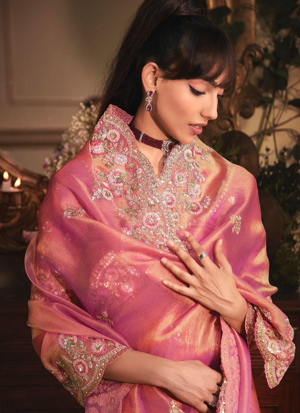 This Pink Organza Tissue Saree is styled with a sequins and zari embroidered border that adds charm to its graceful drape. The lightweight fabric ensures comfort while the border detailing gives it a festive look, making it a great choice for weddings, receptions, and cultural functions. Comes with matching blouse.