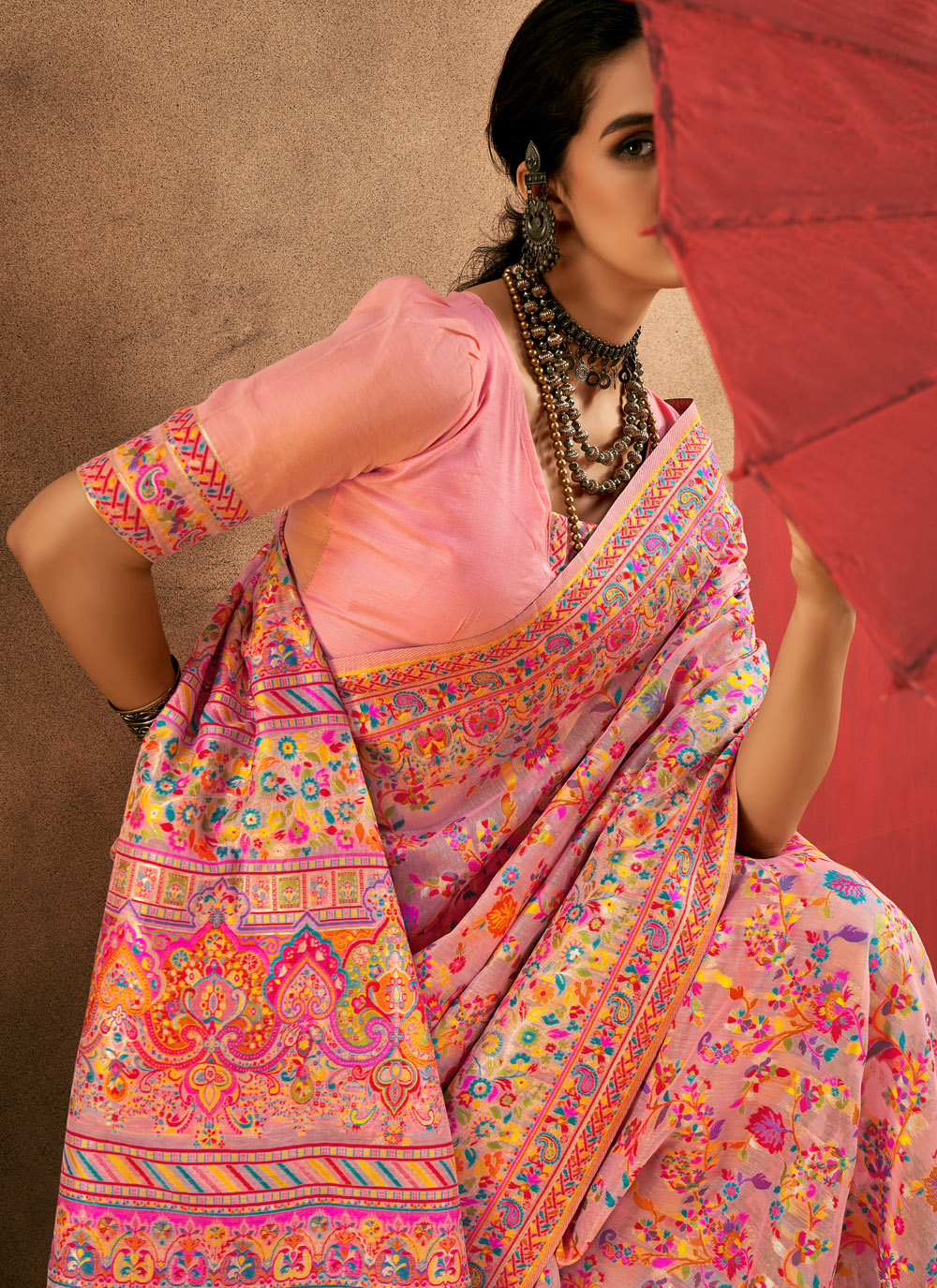 This pink pashmina cotton saree features refined weaving work that adds a modern touch to its soft, elegant look. The soothing pink shade makes it perfect for contemporary ethnic styling. Comes with matching blouse.