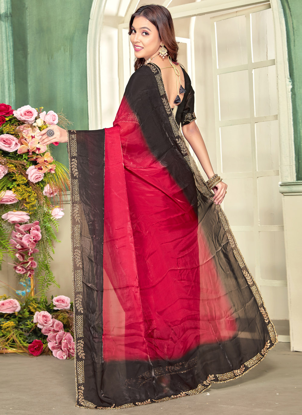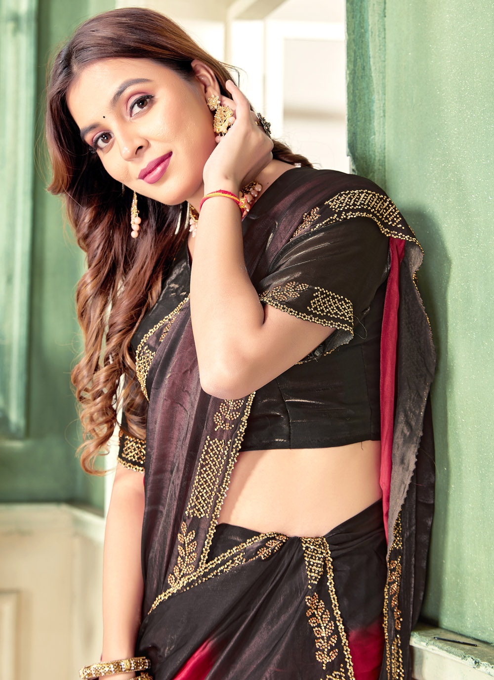 Crafted from premium satin silk, this saree in soft pink features luxurious Zarkan embellishments across the body. The beautifully carved cutwork border enhances its designer look, giving you a blend of glamour and tradition in one piece. Comes with matching blouse.