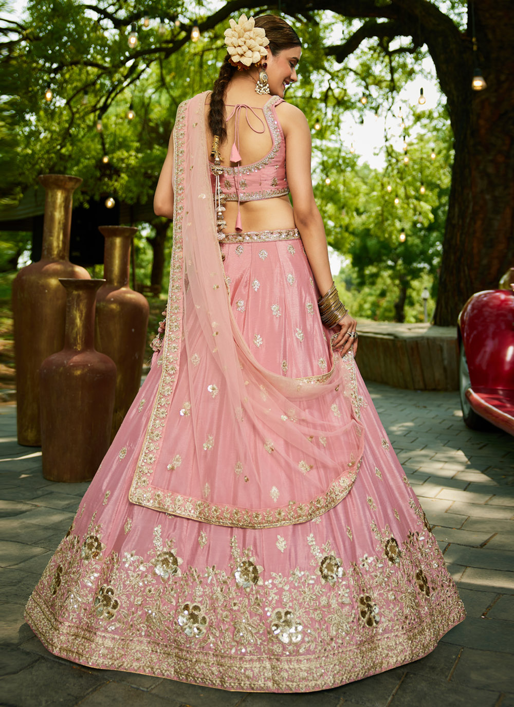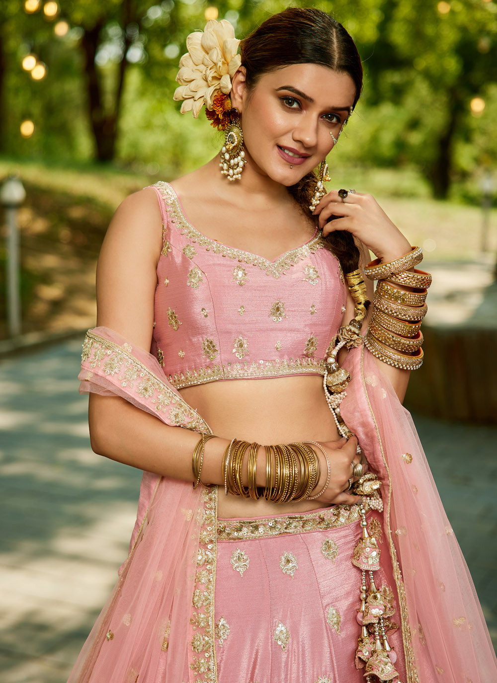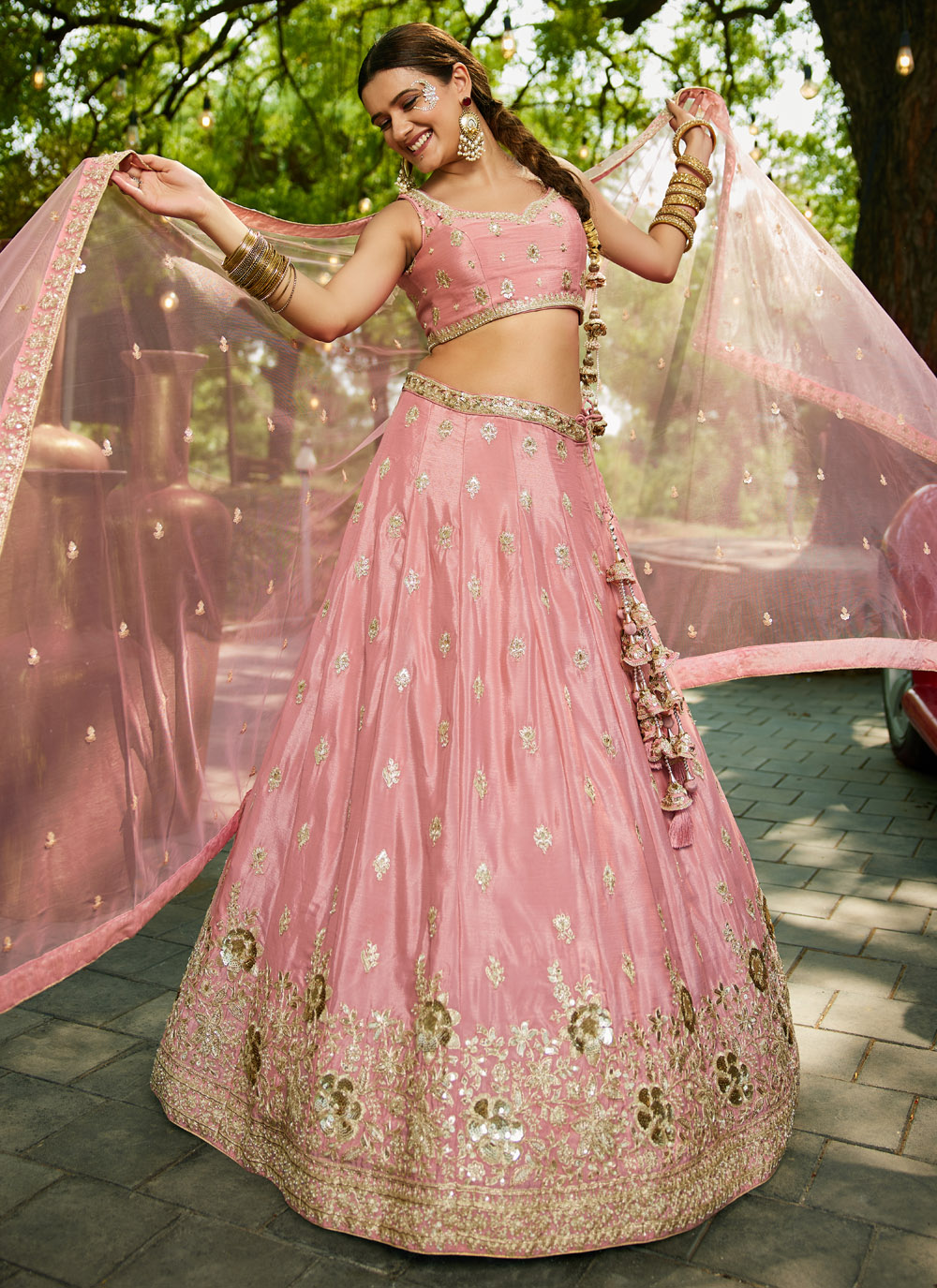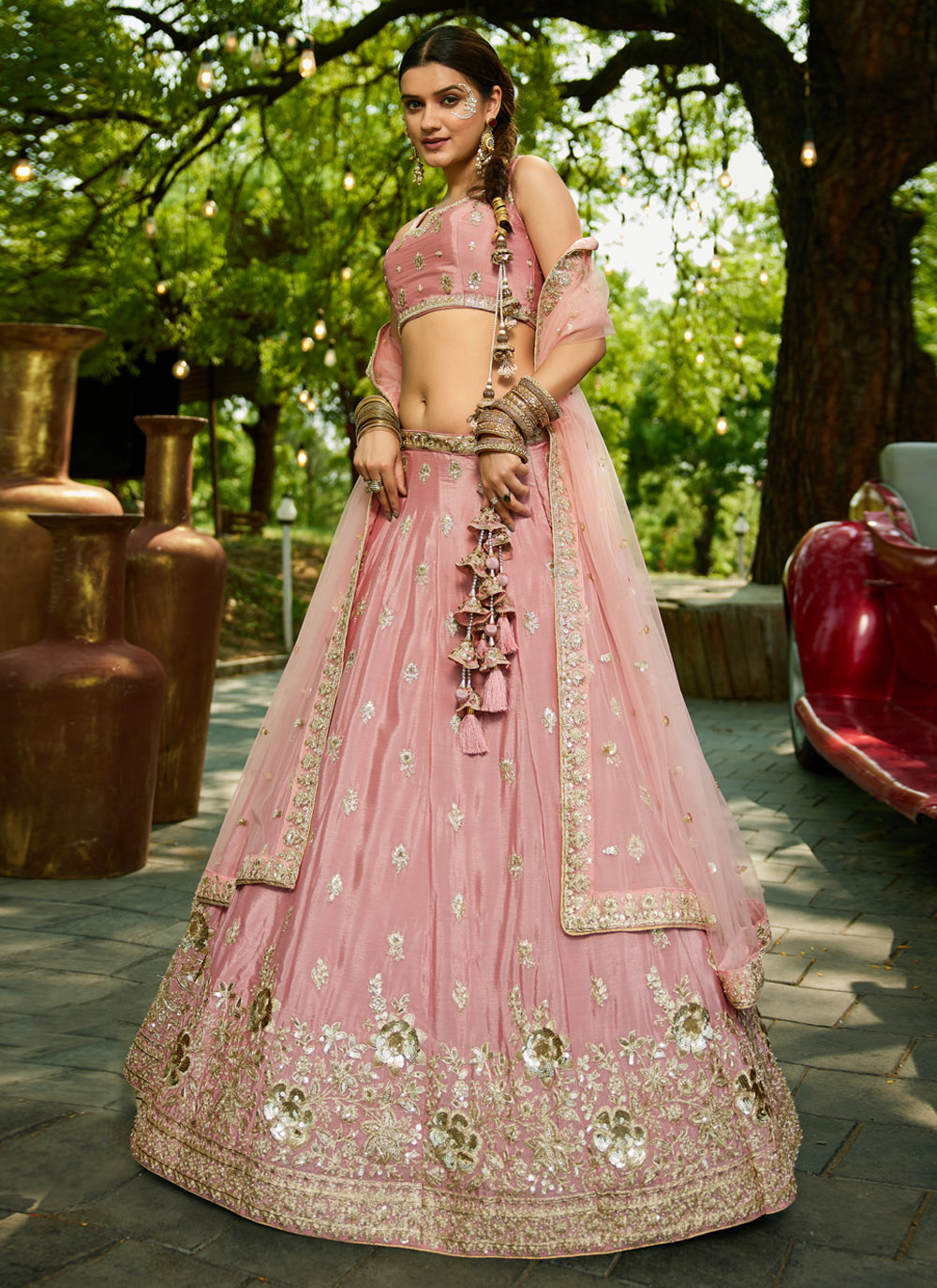 A romantic fusion of craftsmanship and grace, this lehenga choli in soft pink features elaborate beads and sequins work over fine thread embroidery. The lightweight fabric drapes beautifully, making it ideal for bridal engagements and festive gatherings. Comes with matching choli and dupatta.