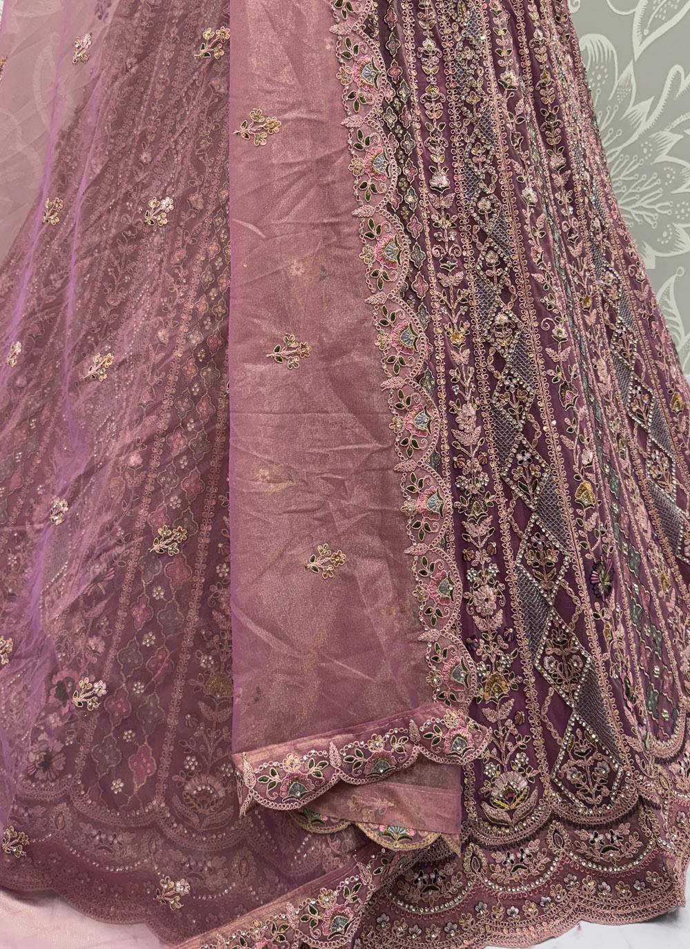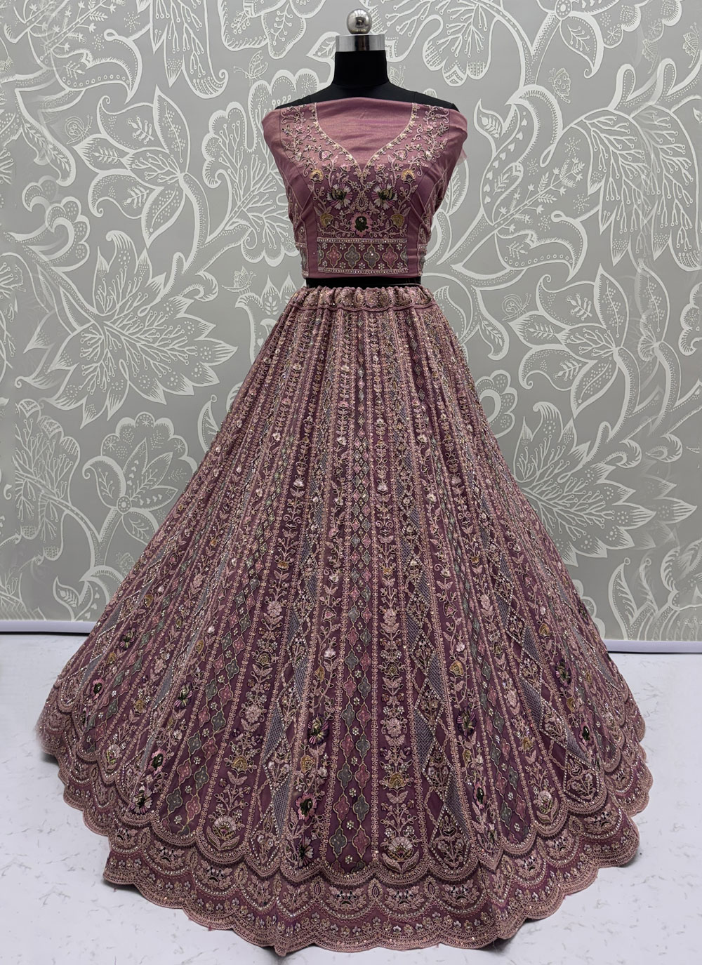 This designer lehenga choli blends traditional artistry with modern elegance. The pink net base paired with detailed embroidery makes it ideal for receptions, engagements, and festive events. Comes with matching choli and dupatta.