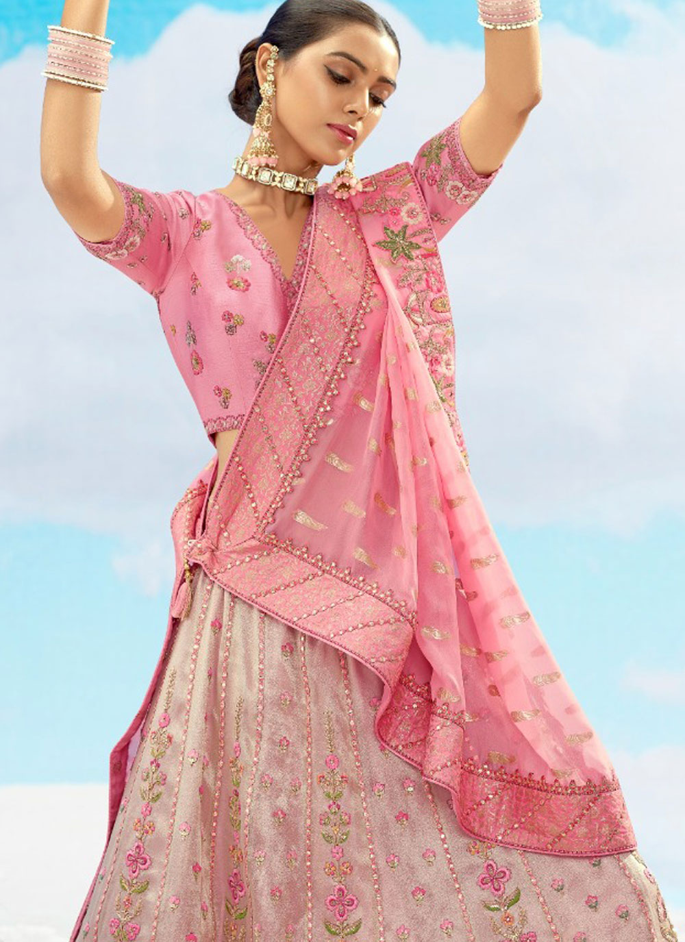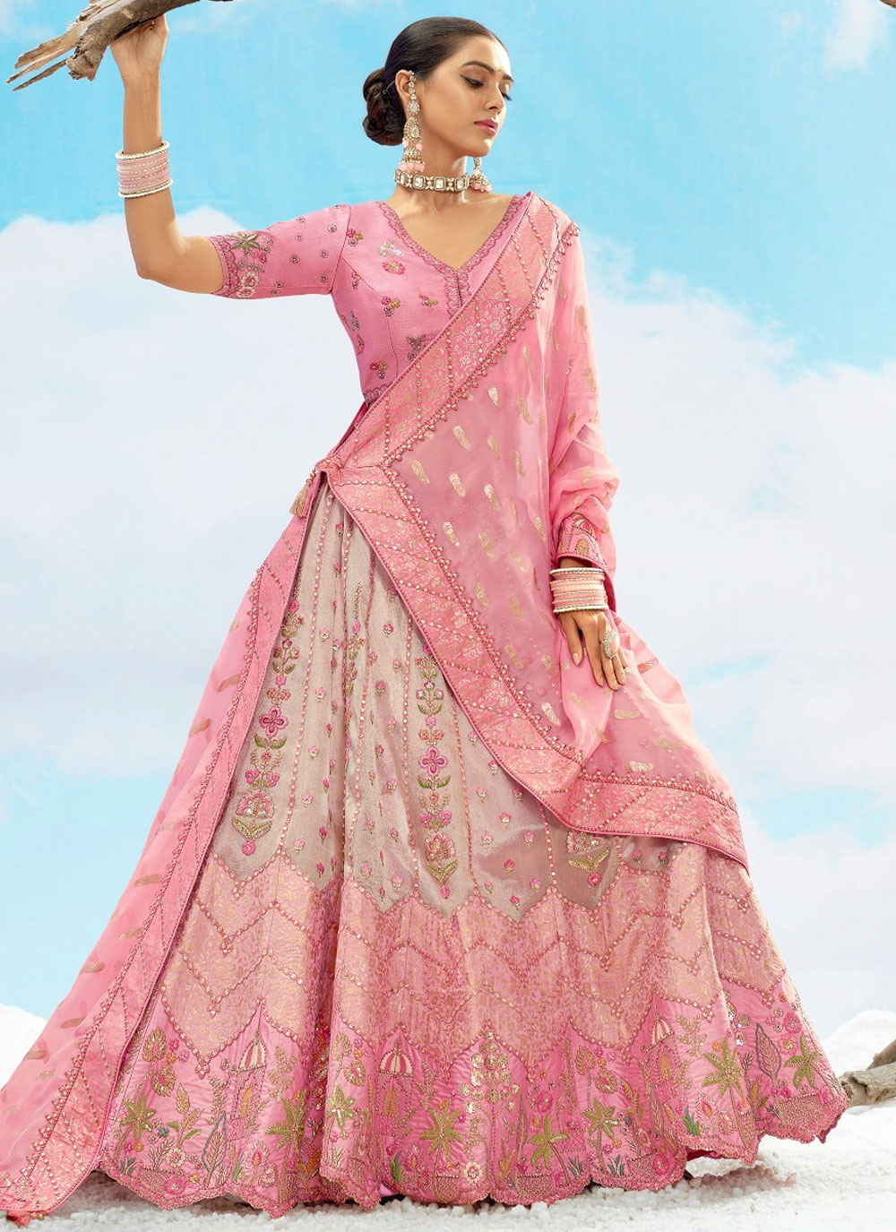 This Pink Silk Lehenga Choli is designed to shine with its exquisite stone and sequins embroidery. The rich pink color paired with the dazzling embellishments creates a captivating look, while the soft silk fabric ensures comfort and luxury. Perfect for brides, bridesmaids, or wedding guests, this lehenga exudes grace and charm.