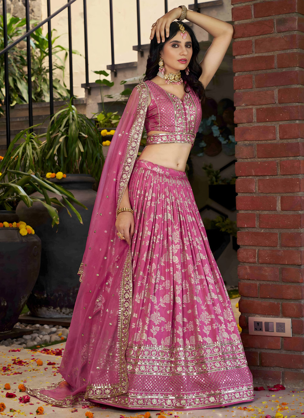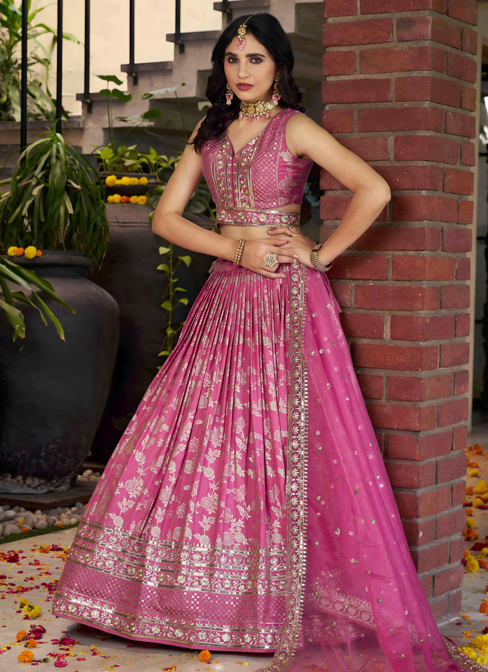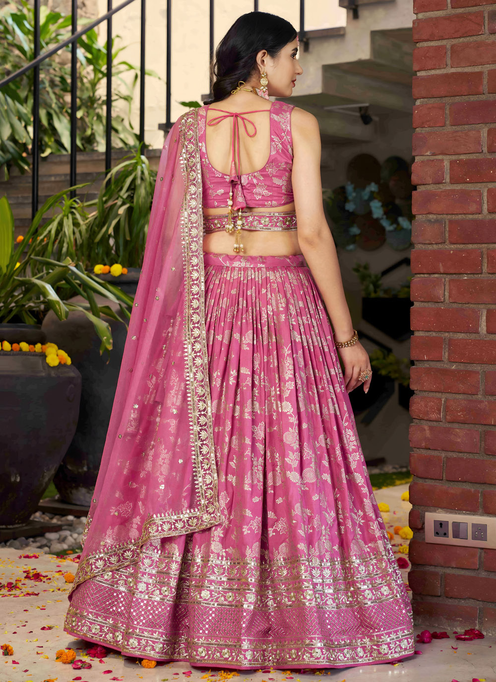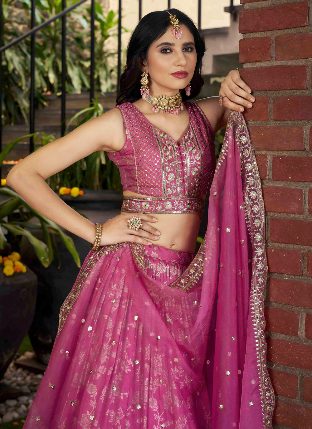 This exquisite pink lehenga choli in pure Dola jacquard fabric features delicate zari embroidery and sparkling sequin highlights that create an enchanting look. The graceful drape and intricate detailing make it a perfect choice for engagement ceremonies, receptions and festive occasions. Comes with matching choli and dupatta.