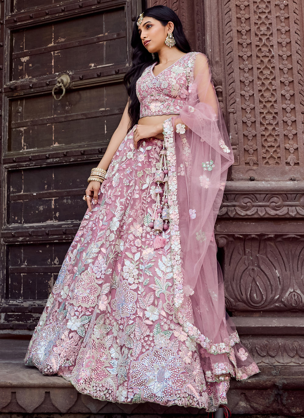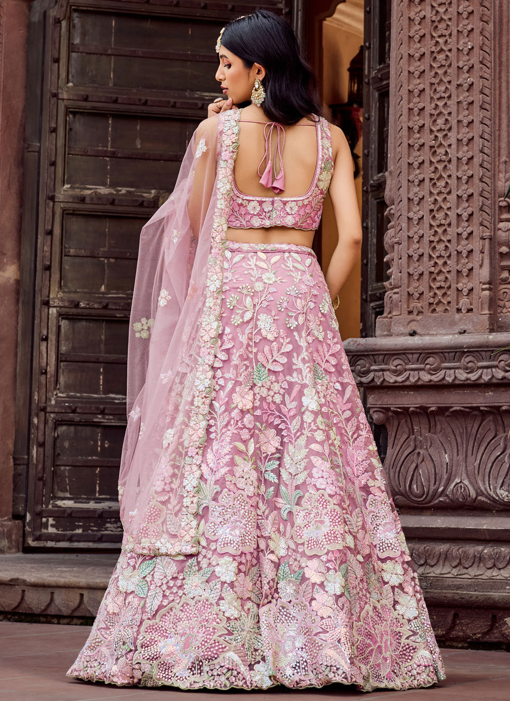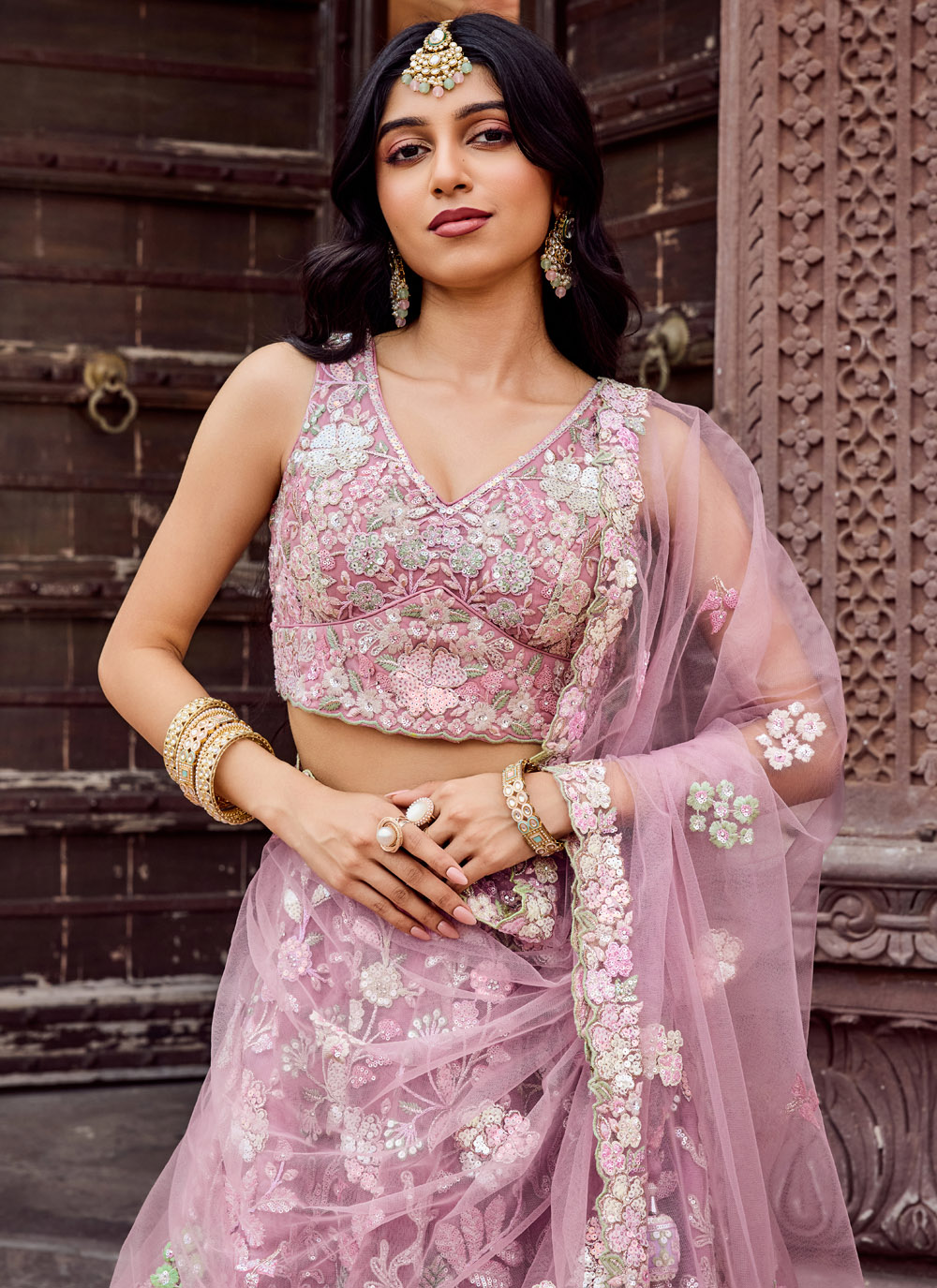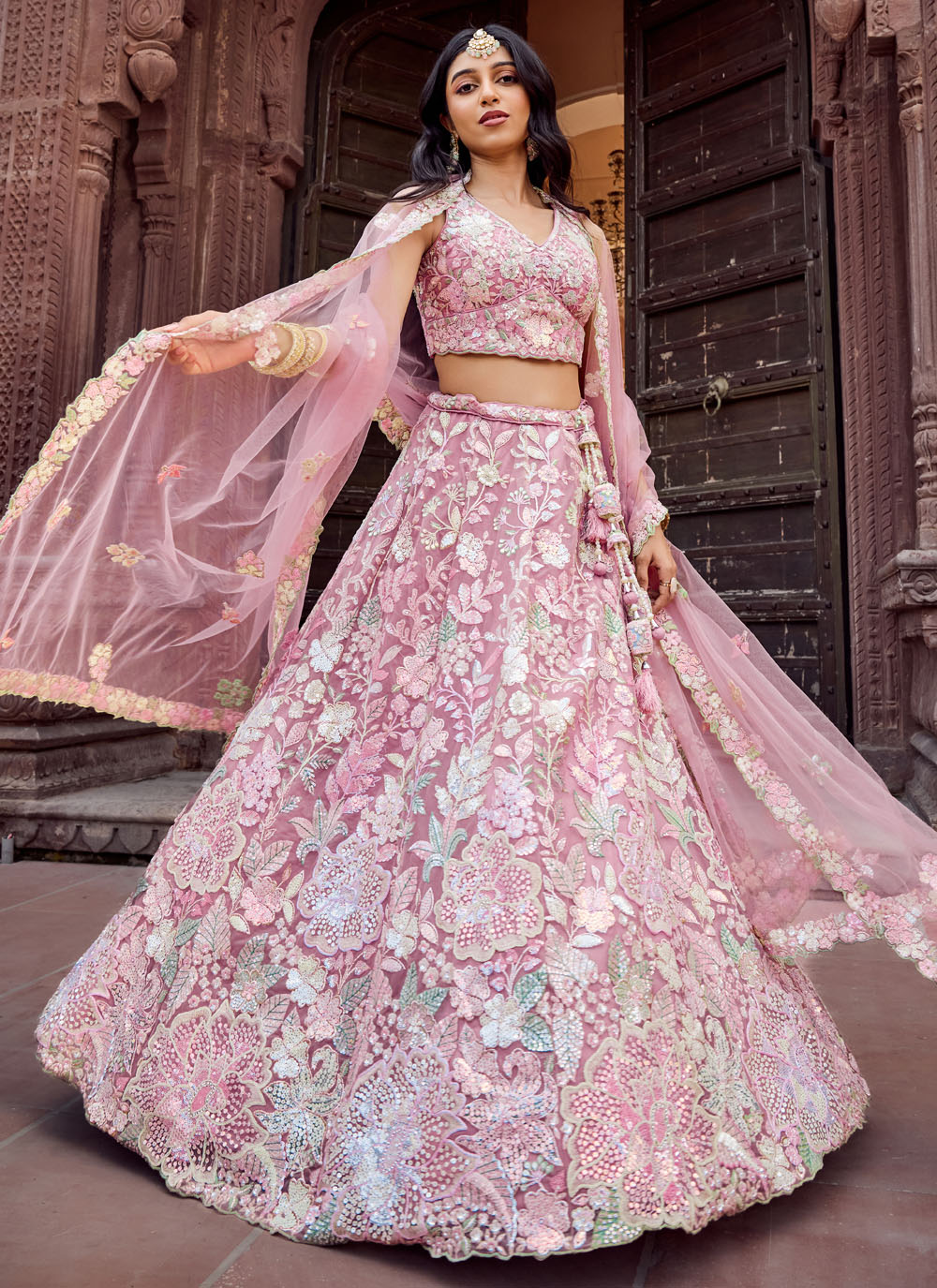 This pink embroidered net lehenga choli redefines traditional elegance with modern finesse. Embellished with sparkling sequins and delicate thread and stone work, it’s an ideal pick for weddings, receptions and engagements. Comes with matching choli and dupatta.