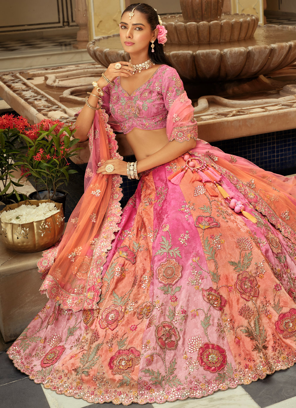 This pink silk lehenga choli brings a graceful charm that is perfect for engagement ceremonies. The smooth silk fabric feels rich and luxurious, while the delicate handwork of sequins, stones, thread and zari creates a soft sparkling effect. Comes with matching choli and dupatta.