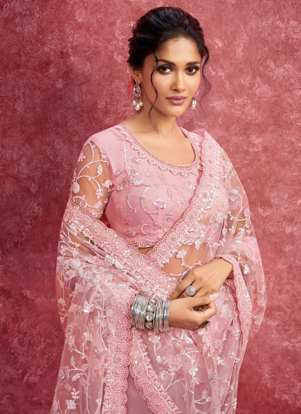 Crafted in soft net, this pink saree is highlighted with intricate sequins and thread embroidery. The designer cut work along with dazzling stone accents makes it a striking choice for engagement wear. Comes with matching blouse.