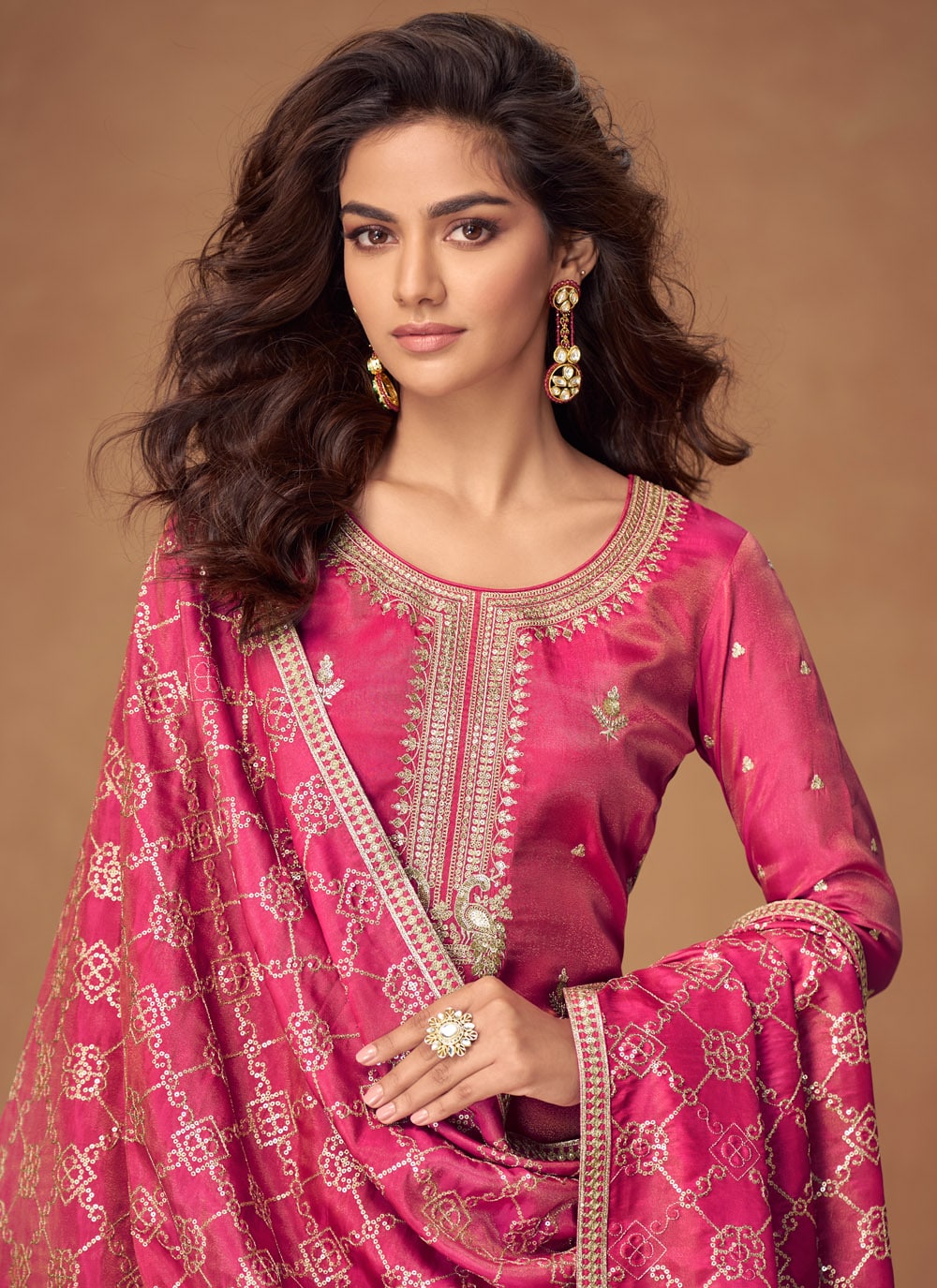 Dazzle with grace in this pink shimmer silk embroidered salwar suit, highlighted with delicate zari and sequins work. With its designer finish and rich appeal, this outfit is perfect for festive wear and grand occasions. Comes with matching bottom and dupatta.