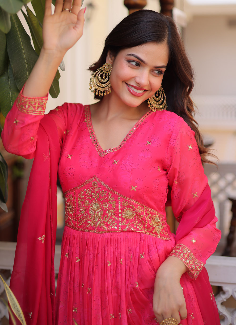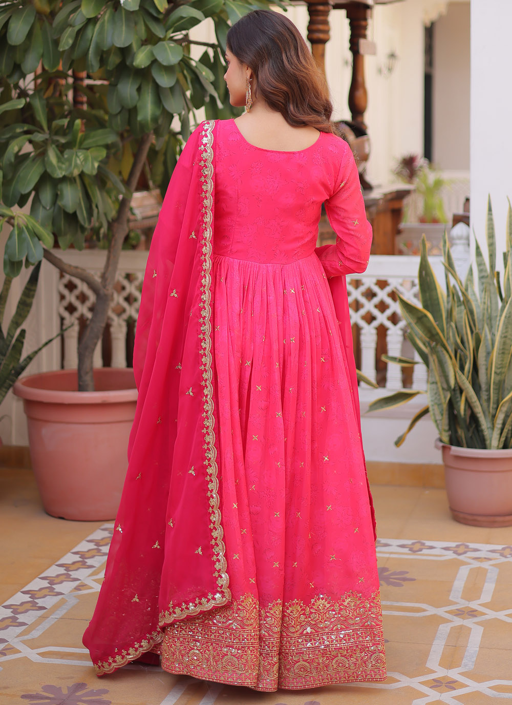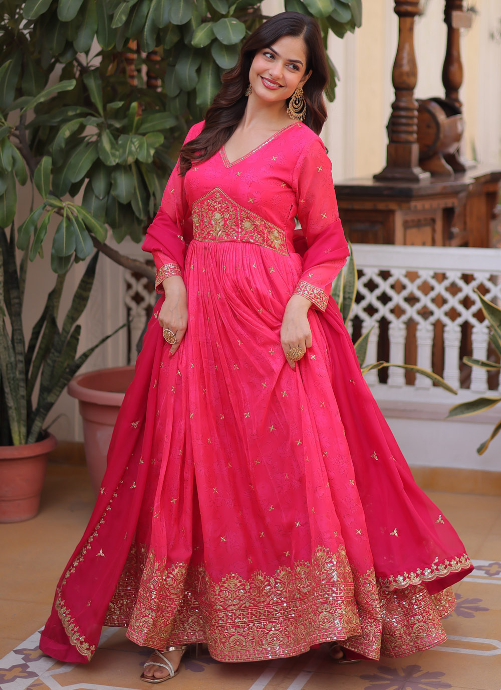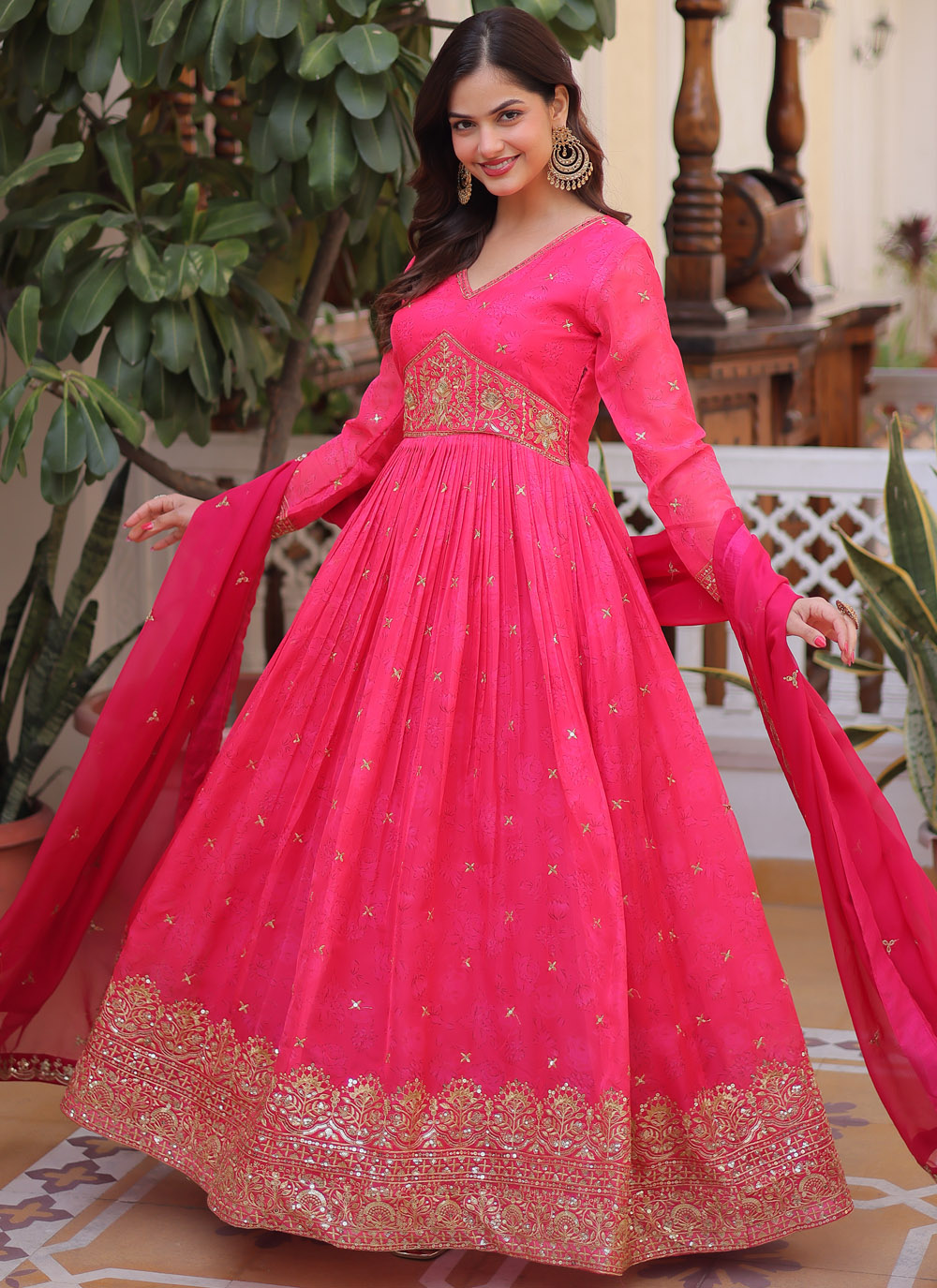Buy Pink Silk Digital Printed and Embroidered Designer Gown online from Manthan Fashion. Shop stylish pink silk gown crafted for receptions, engagement ceremonies, and celebration wear. Comes with matching dupatta.