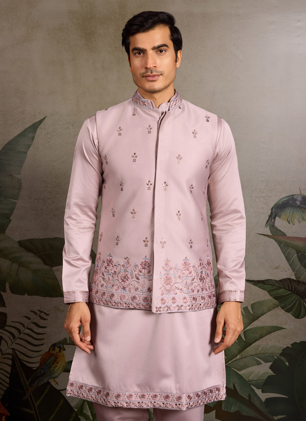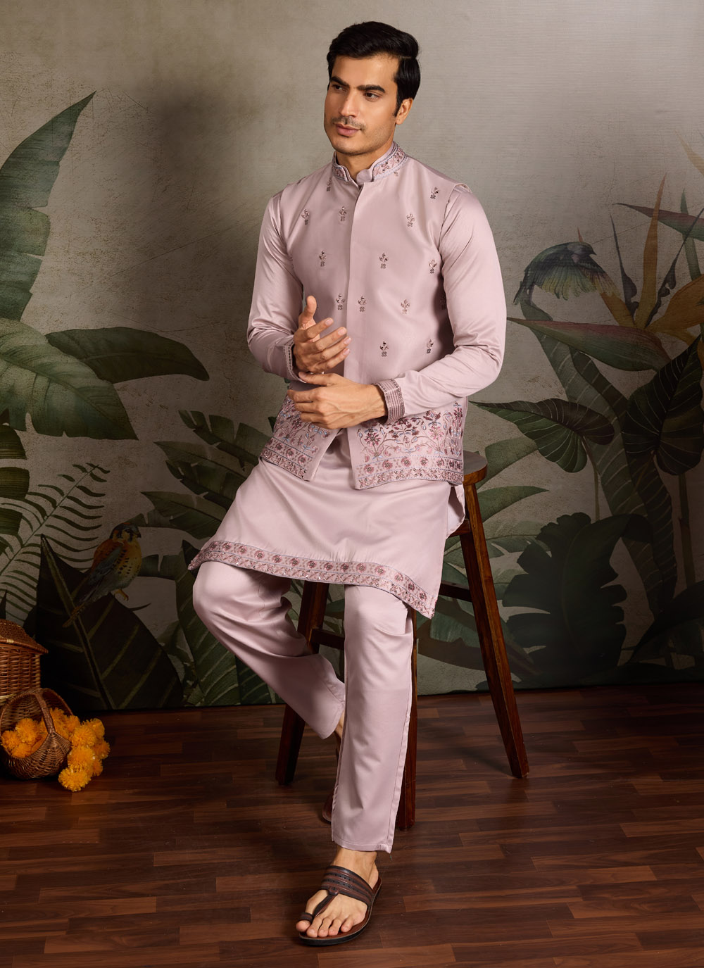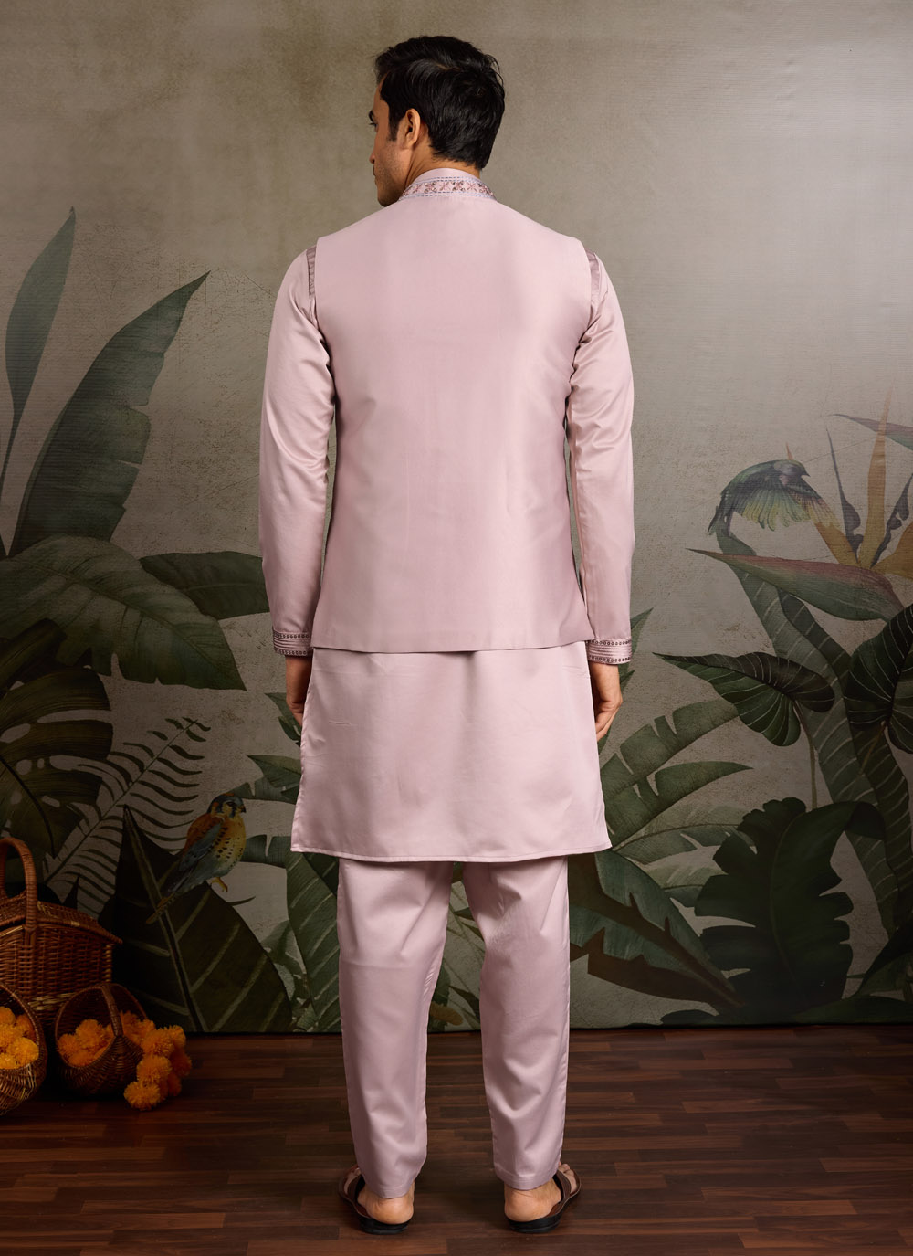 Command attention with elegance in this Pink Silk Kurta Pajama set paired with a finely embroidered jacket. Crafted for the modern man who appreciates traditional artistry, it's a standout ensemble for weddings, receptions, and festive functions.
