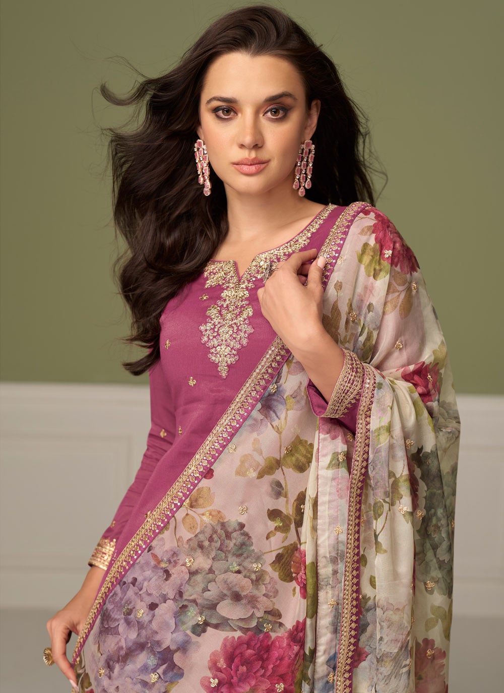 This embroidered silk salwar kameez in pink brings out an understated elegance ideal for day-to-evening events. The palazzo bottom gives a contemporary flair, while the embroidery highlights ethnic artistry. Comes with matching bottom and dupatta.