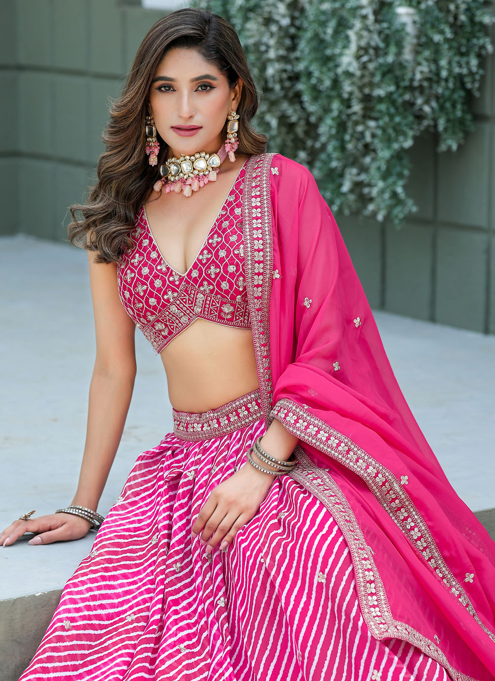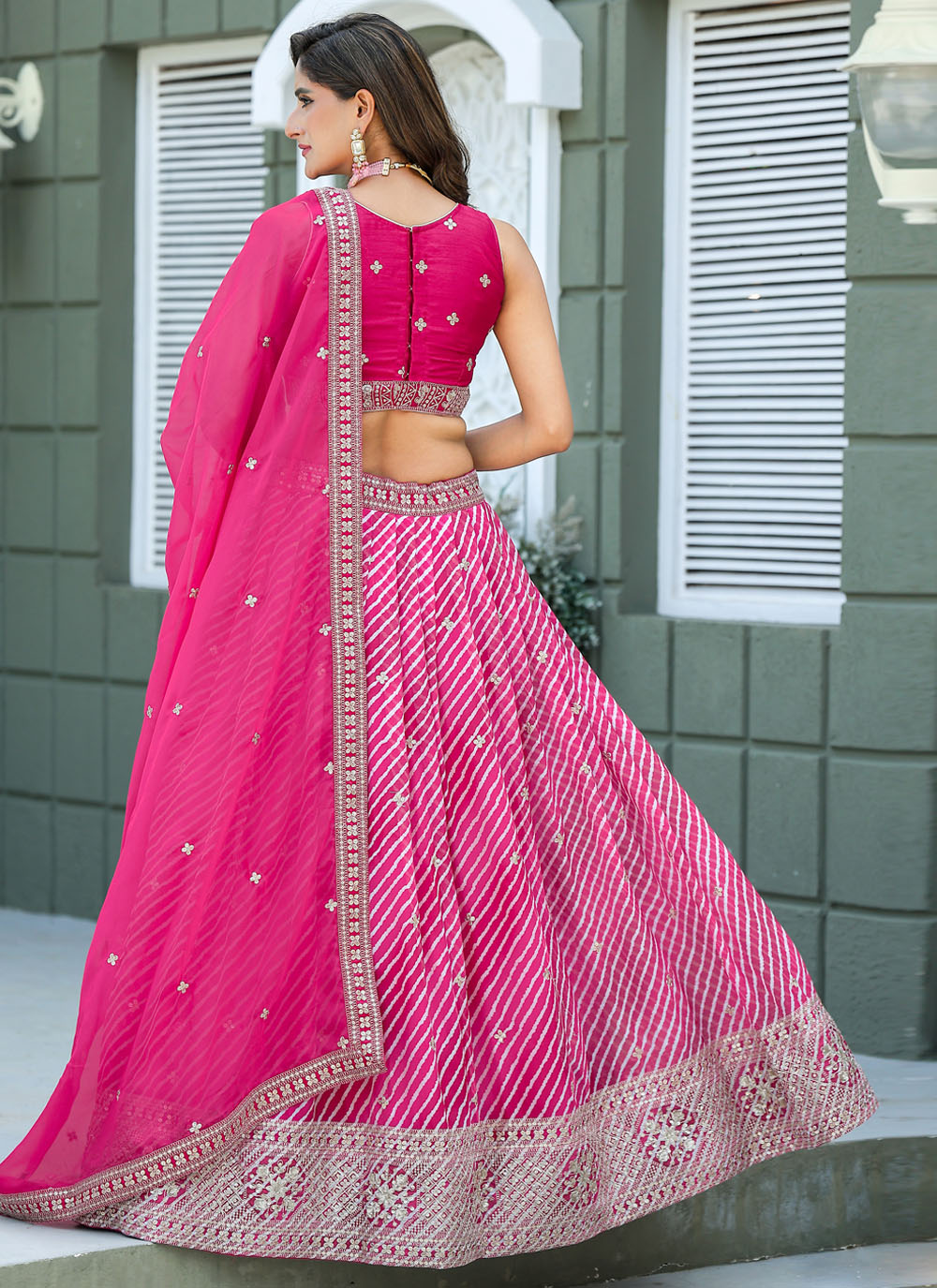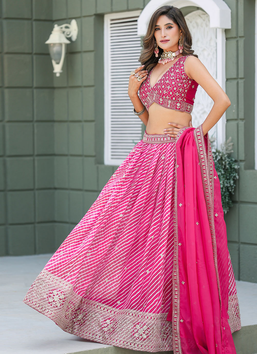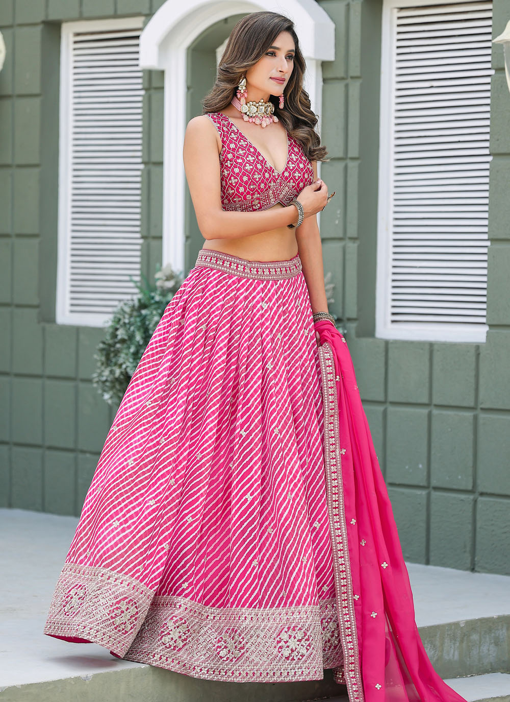 This pink silk lehenga choli brings together shimmering sequins work and artistic printed patterns, creating a stylish fusion of glamour and tradition. Its smooth texture and finely crafted embroidery make it a stunning choice for weddings and special events. Comes with matching choli and dupatta.