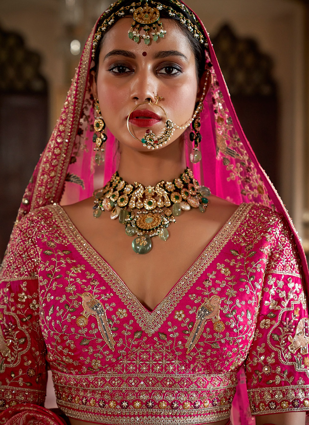 Make your wedding moments unforgettable with this beautifully crafted pink lehenga choli. The combination of silk fabric and rich embroidery work enhances its elegance, offering a perfect balance of tradition and modern bridal fashion. Comes with matching choli and dupatta.